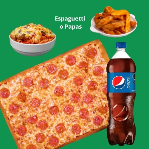 Pizza de 8 rebanadas + Espagueti o Papas + Refresco de 2 litros