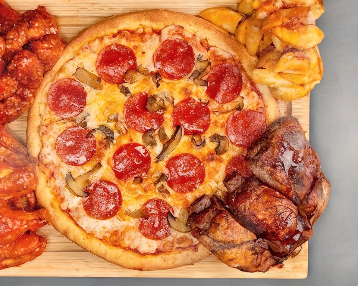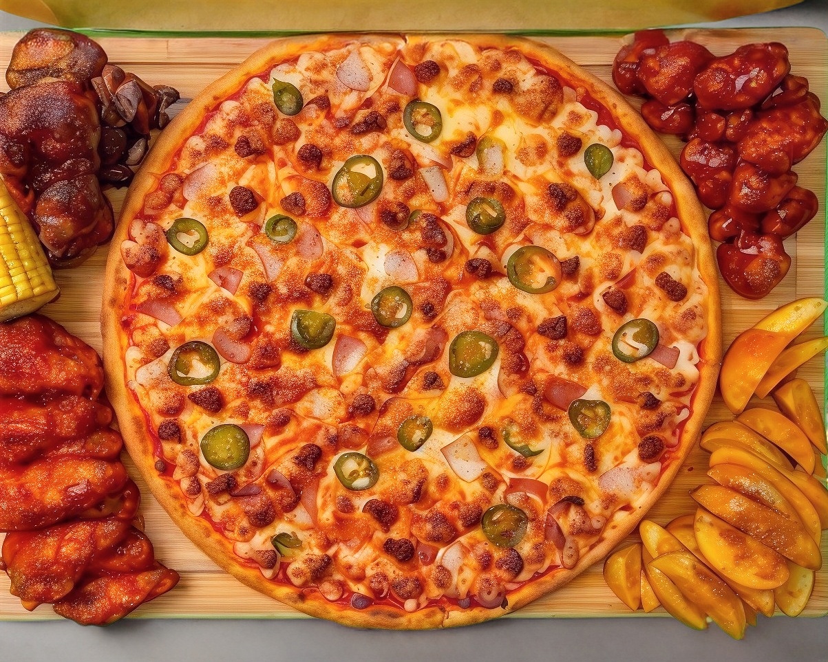 Pizza personal 2 ingredientes, 150 grs de papa gajo, 5 alitas, 150 grs boneless, 150 grs de costillitas (salsa a elegir, bbq, red hot, burriolis) .