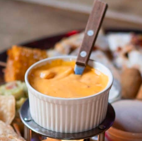 Papas a la francesa, sazonador a elección, champiñones, blue cheese, aderezo chipotle, queso gratinado y salsa de queso.