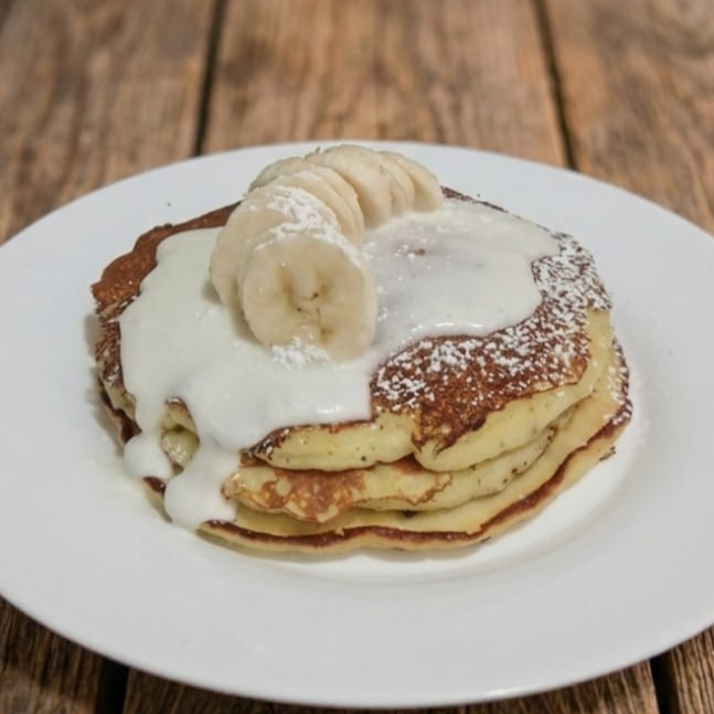 Pieza de Hotcake GRANDE hecho con Buttermilk con un extra de esponjosidad y sabor, bañados en una crema batida, plátanos, cajeta o lechera