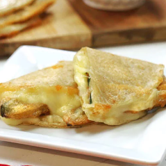 Quesadilla al mojo de ajo en tortilla de harina acompañada de verdura y salsa