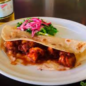 taco de guiso de camaron y res en tortilla de maiz acompañado de salsa y verdura