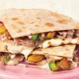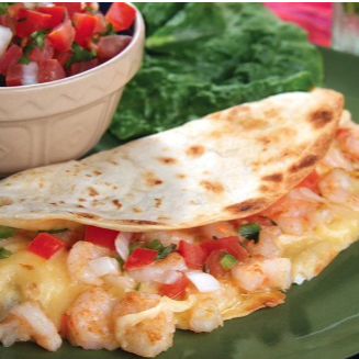 Qesadilla de camaron a la diabla en tortilla de harina acompañada de verdura y salsa