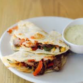 quesadilla de guiso de res y camaron en tortilla de harina con queso acompañado de salsa y verdura