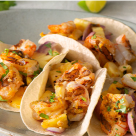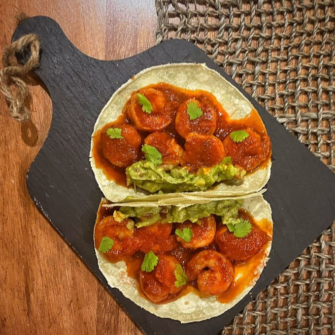 Taco de camaron a la diabla en tortilla de maiz acompañado de verdura y salsa