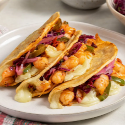 Quesadilla de camaron capeado en tortilla de harina acompañada de verdura y salsa