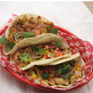 Taco de camaron al mojo de ajo en tortilla de maiz acompañado de verdura y salsa