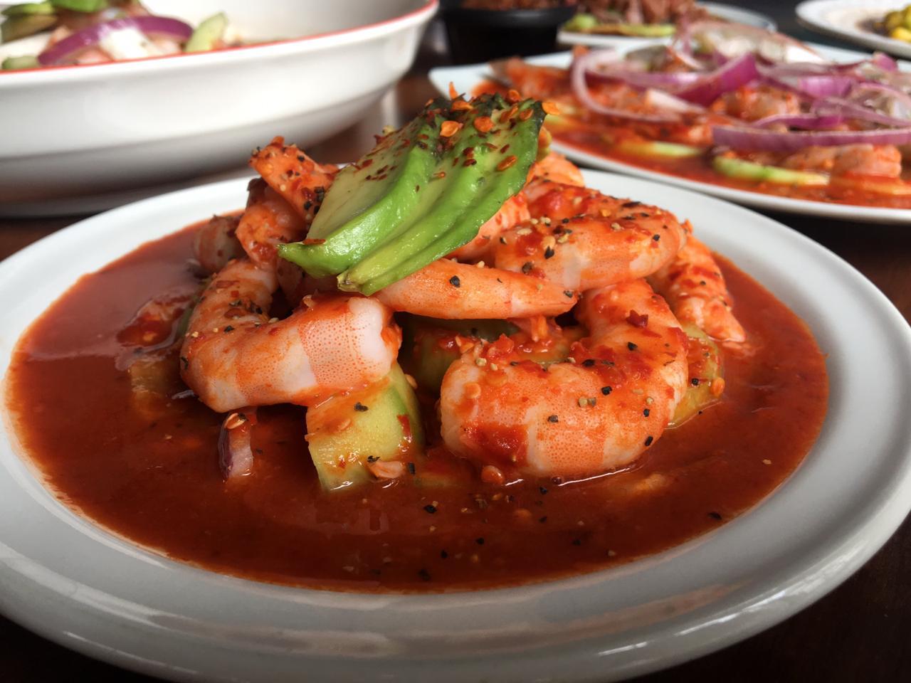 AGUACHILE DE CAMARON COCIDO Y CRUDO, BAÑADO EN SALSA NEGRA.