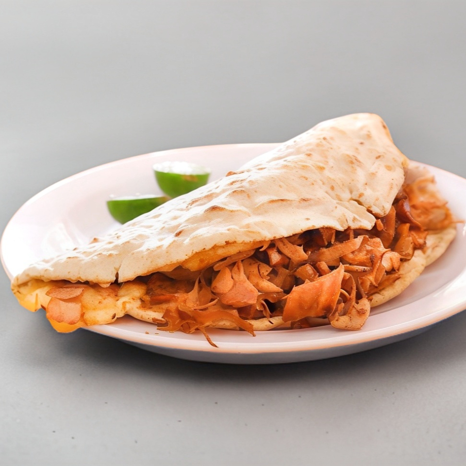 Taco con doble tortilla, salsa picante, guacamole, limones, cebolla con habanero.