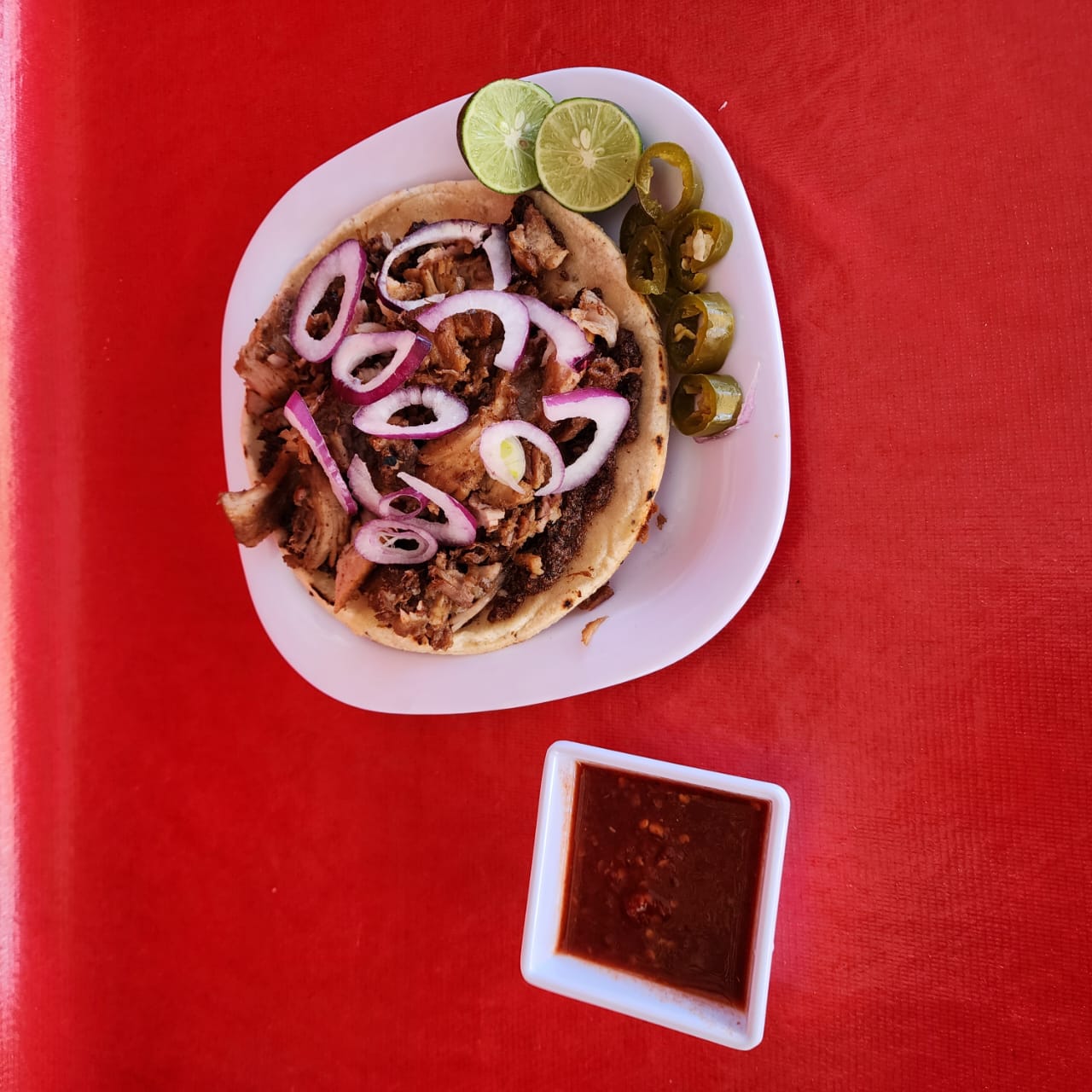 Quesadilla de carnitas con doble tortilla, acompañada de salsa de la casa, cebolla. limón y chile.