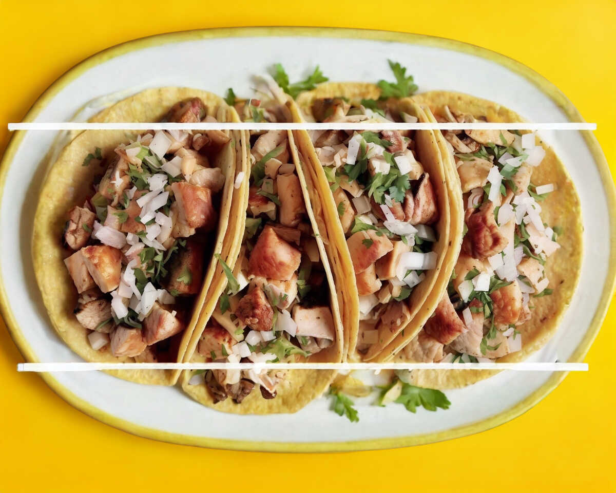 Taco, doble tortilla, chicharrón de puerco, se acompaña con todos los complementos.