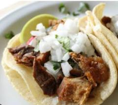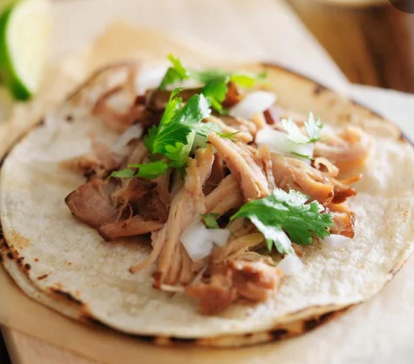 Taco especial carnitas, doble tortilla, carnitas se acompaña con salsas, limones y cebolla curtida.