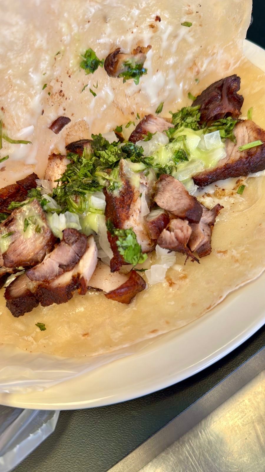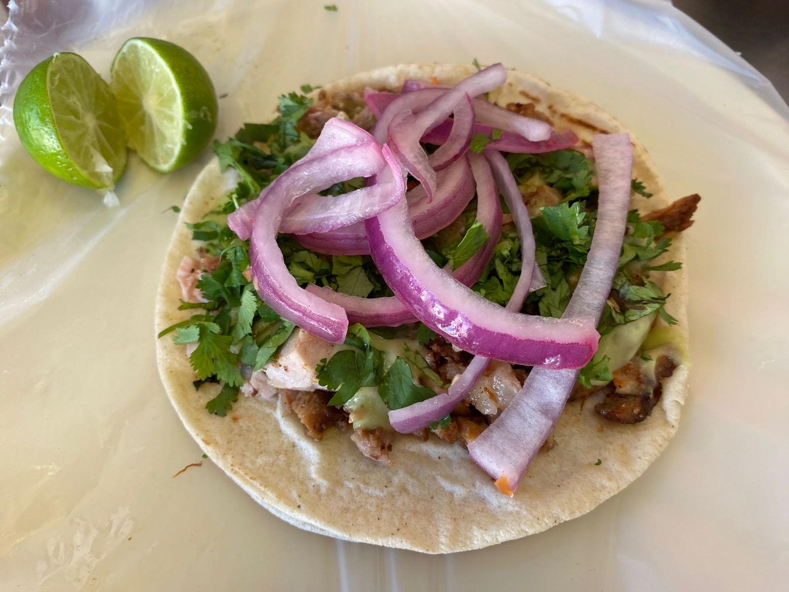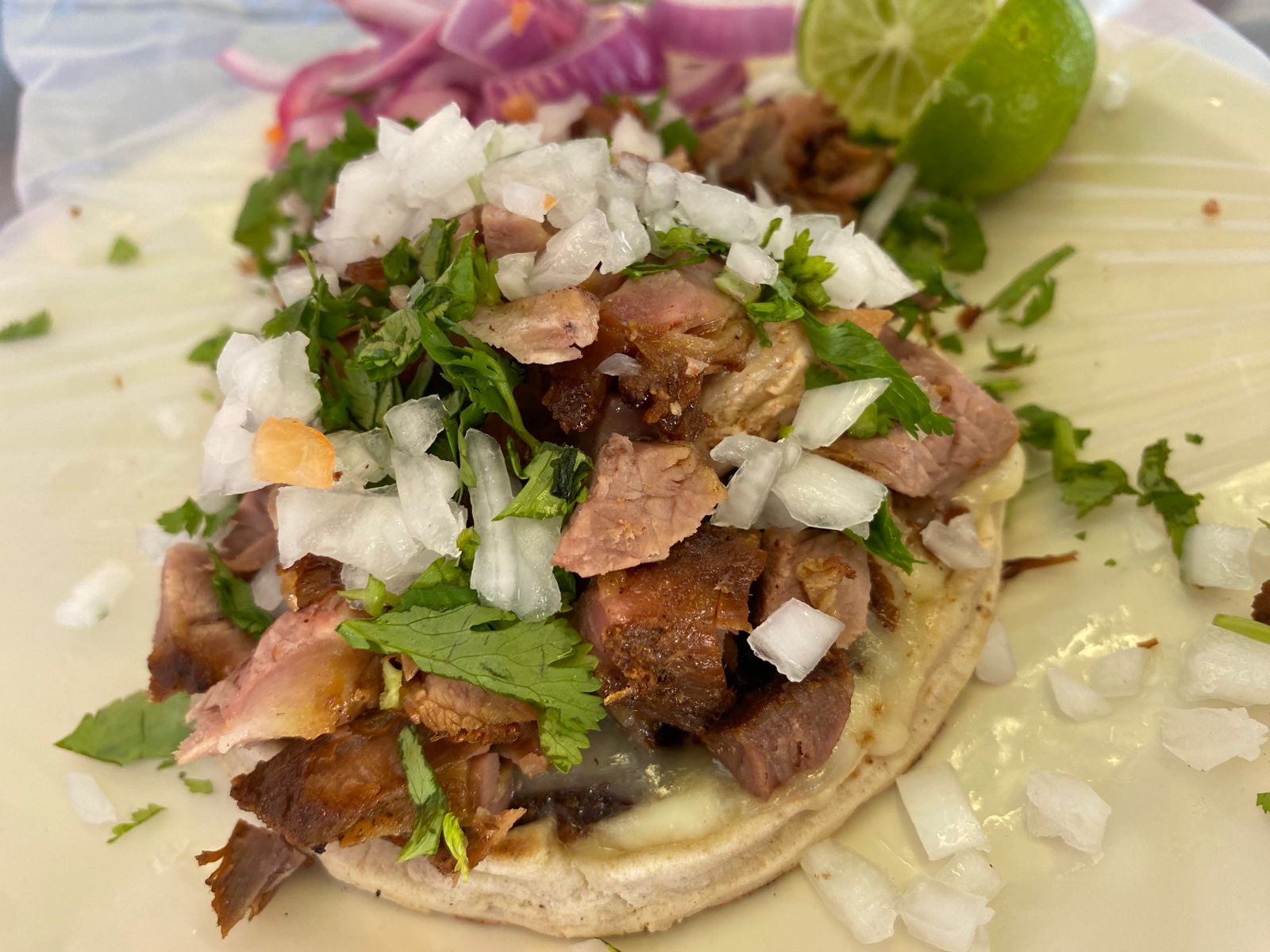 que sea lleva 1/4 de tortillas de maíz, cilantro, cebolla blanca, cebolla morada curtida con habanero, salsa verde, salsa roja y cilantro