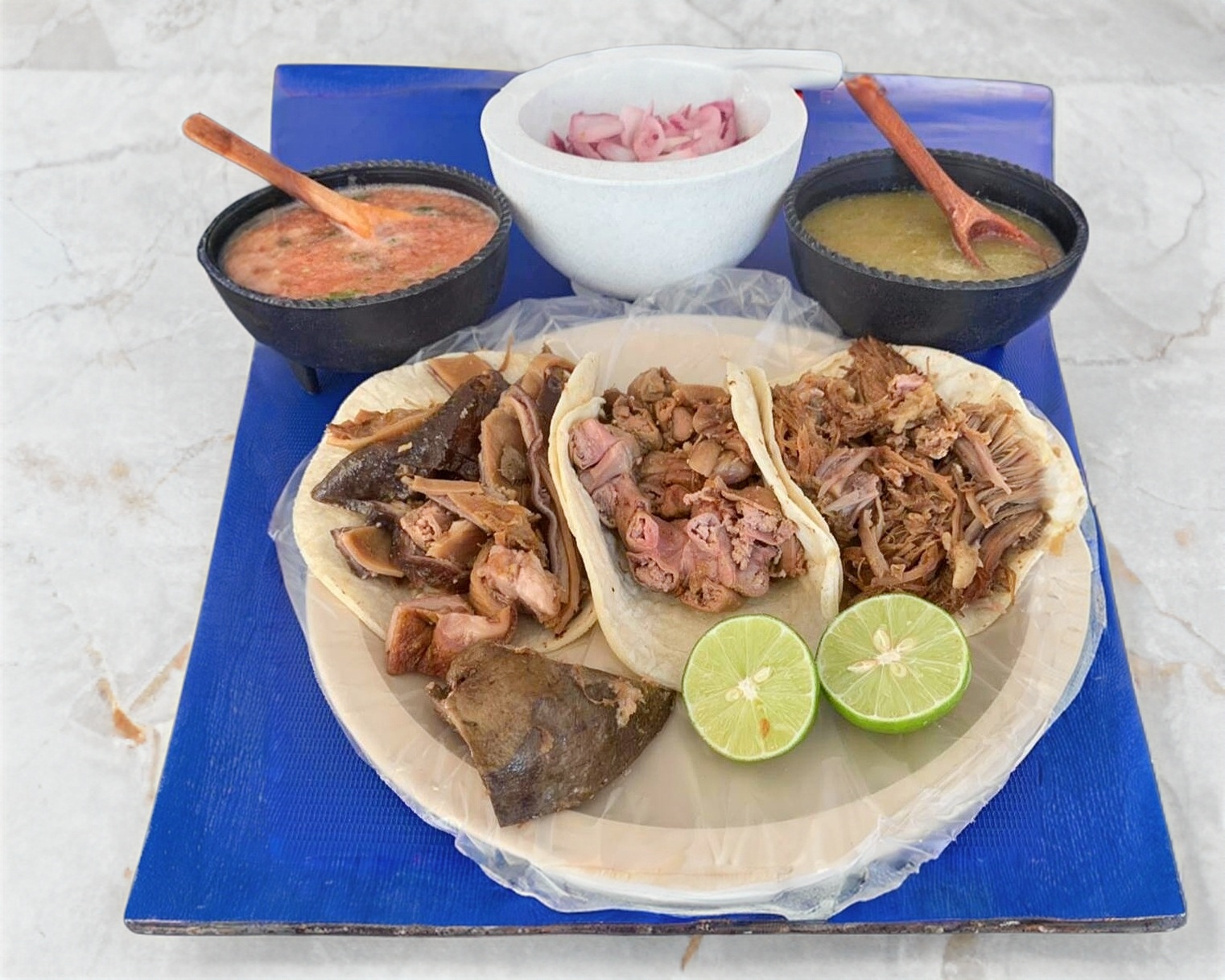 Dos tortillas, salsas de tomate, verde, y cebolla con habanero, limones aparte.