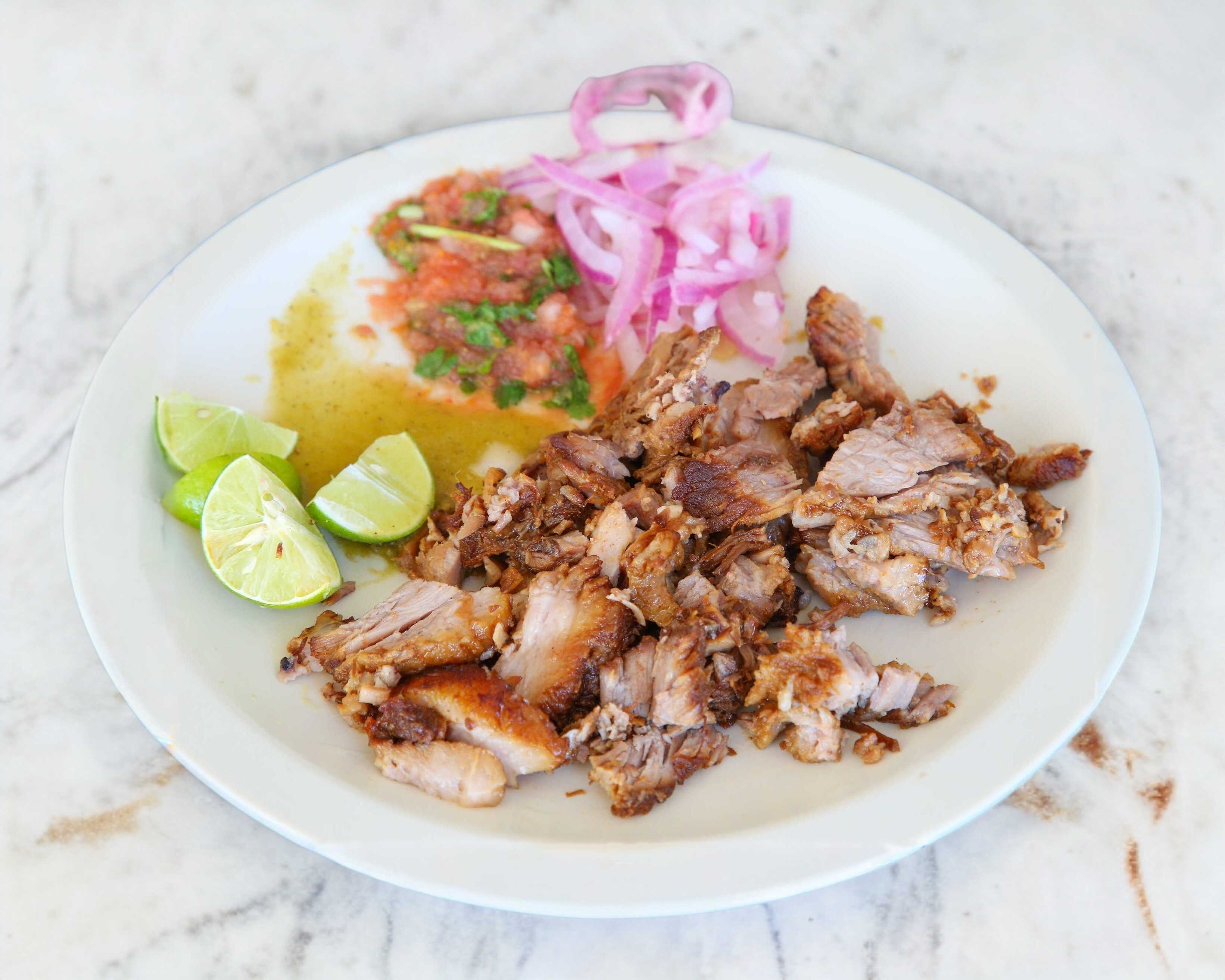 Carne de cerdo, 8 tortillas, salsa de tomate chile habanero, salsa verde y cebolla con habanero, limon y aparte limones