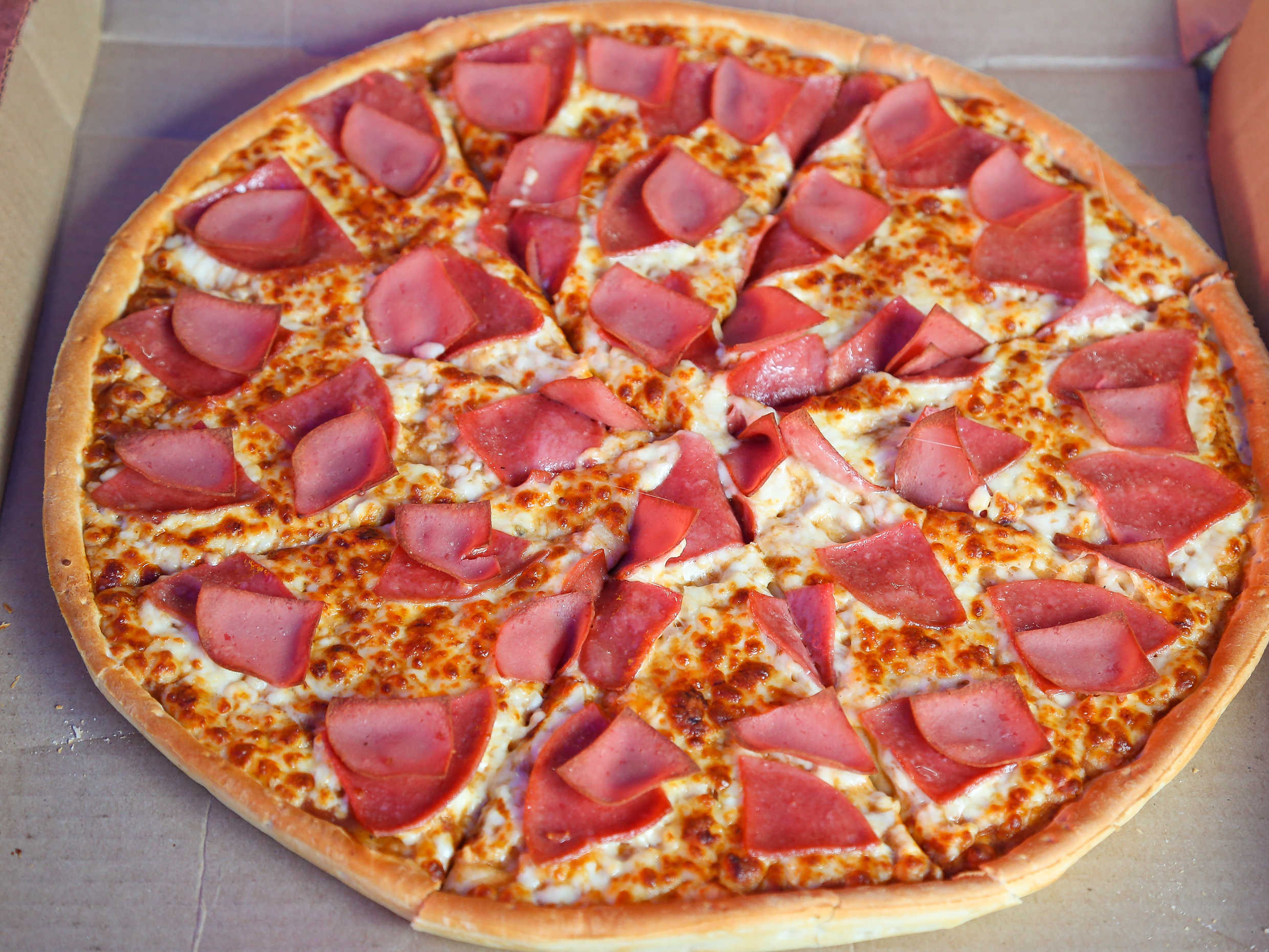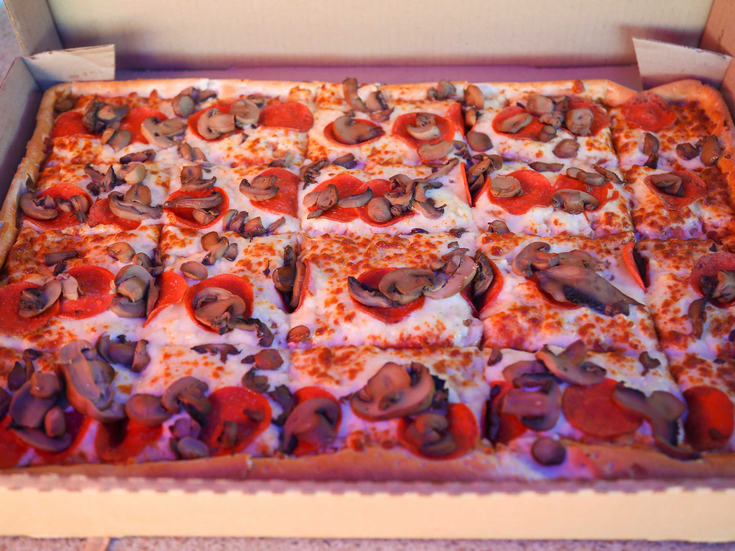 Pizza de 20 pedazos mide 20.5*11.5 cm de 2 ingredientes (para máximo 5 personas), (jamón, tocino, pepperoni, champiñón, salchicha, salami, entre otros), aderezo extra con costo adicional.