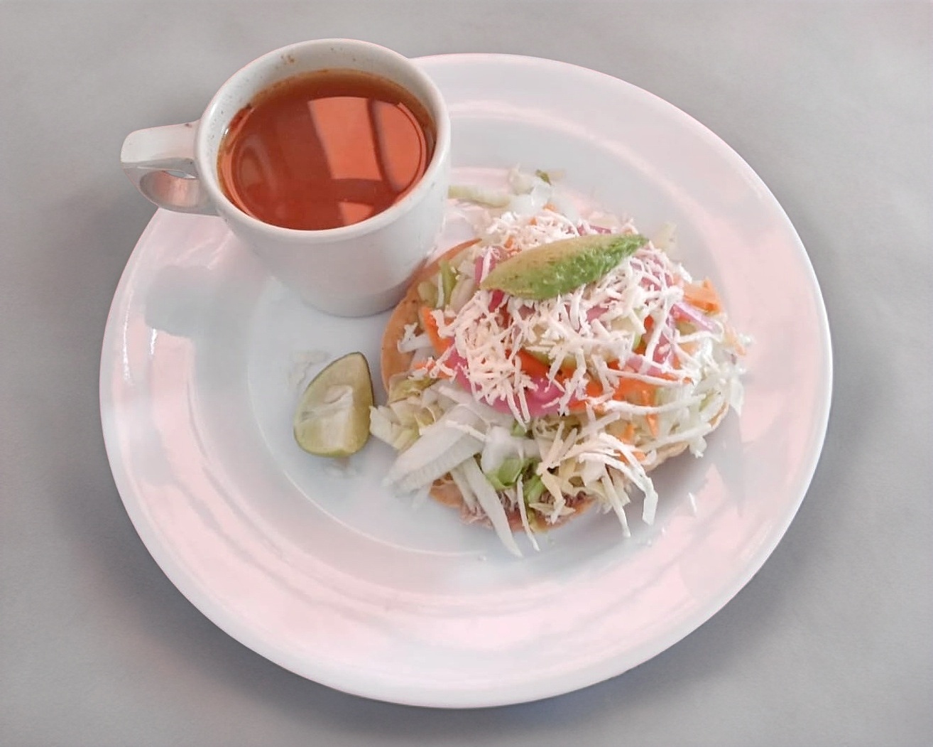 Tostada de res preparada con frijol, lechuga, zanahoria, cebolla, aguacate, pepino, queso, media crema, salsa y consomé.