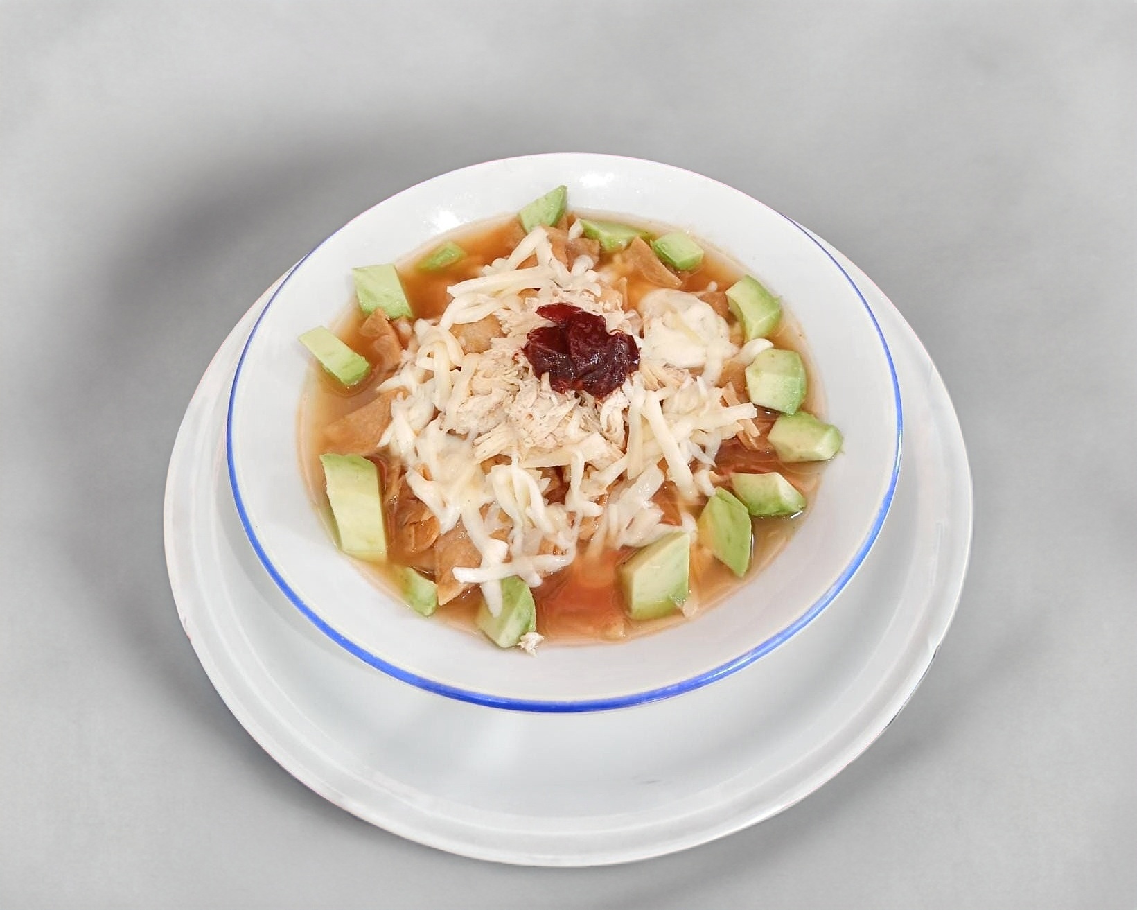 Deliciosa sopa con fritura de tortilla, aguacate en cubos, pechuga de pollo, queso Chihuahua, chipotle, limón y media crema.