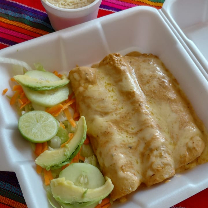 Deliciosas enchiladas de tomate, queso, lechuga, pepino, cebolla, aguacate, frijol y consomé.