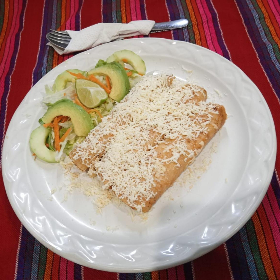 Enchiladas de pollo, queso gratinado y crema chipotle, acompañado de ensalada de lechuga, pepino, zanahoria y aguacate, frijoles por separado. Plato personal.
