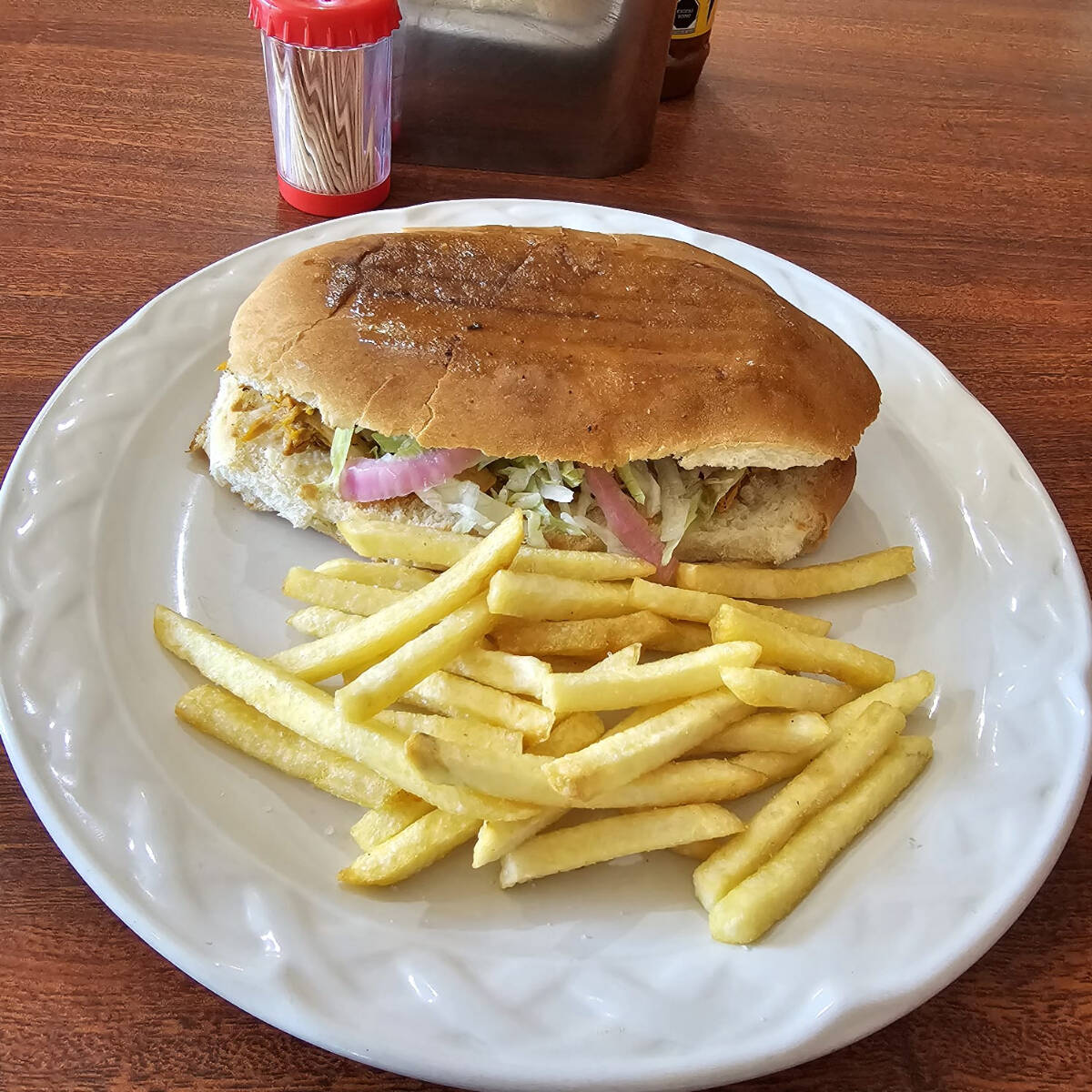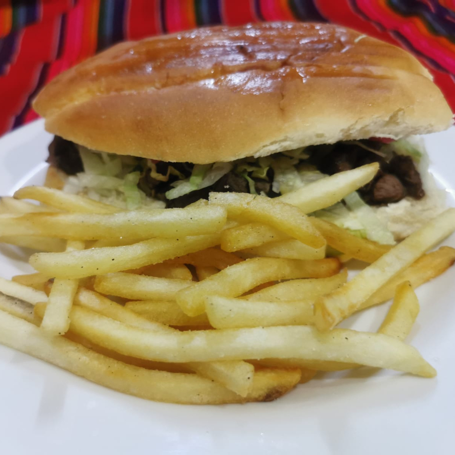 Cochinita, queso, jamón, lechuga, cebolla, aguacate y chiles jalapeños, acompañada de papas a la francesa.