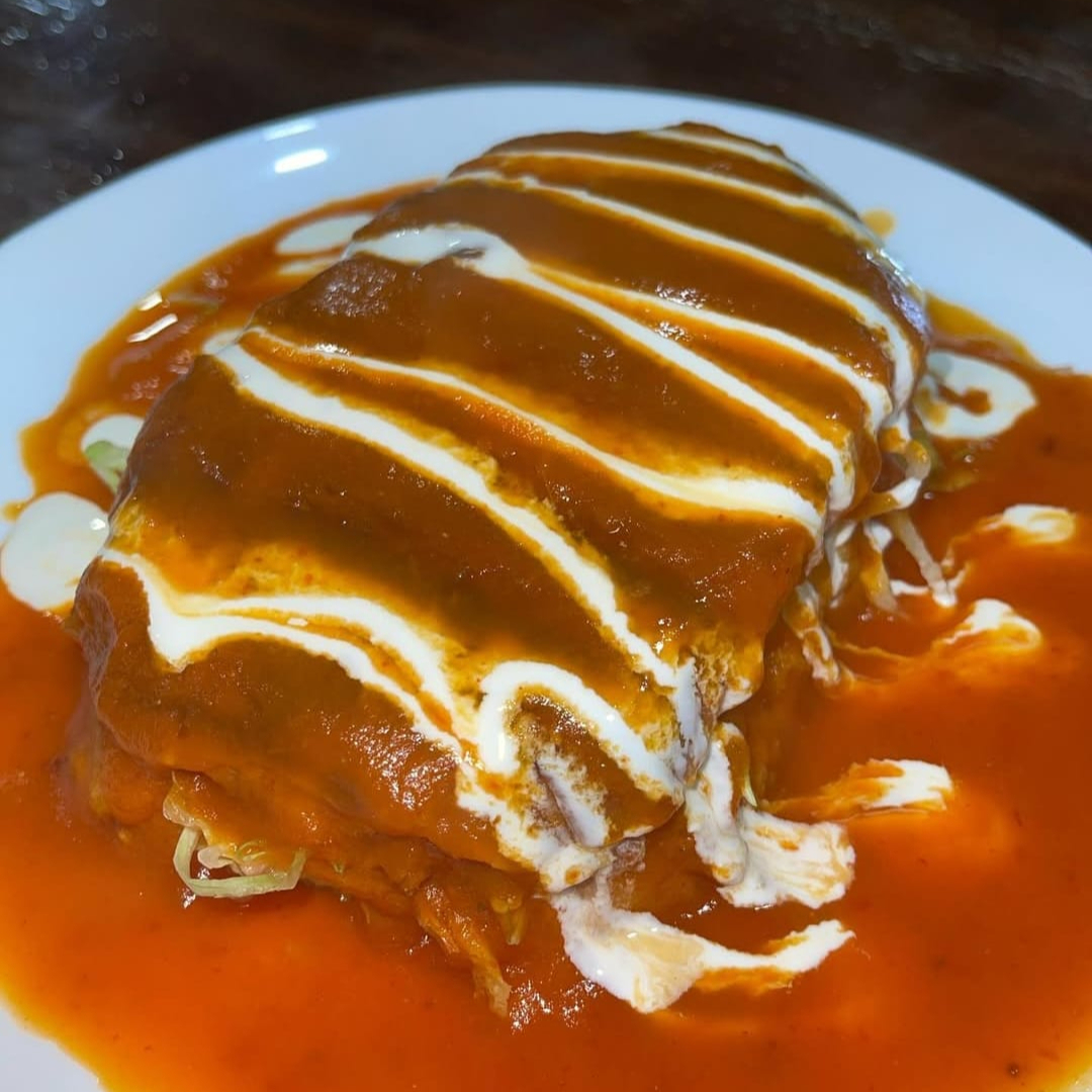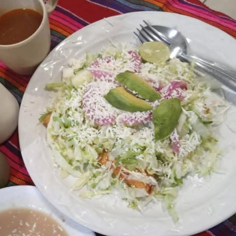 Tortilla bañada con chile colorado, rellena de queso, lechuga, pepino, cebolla, aguacate, frijol y consomé.