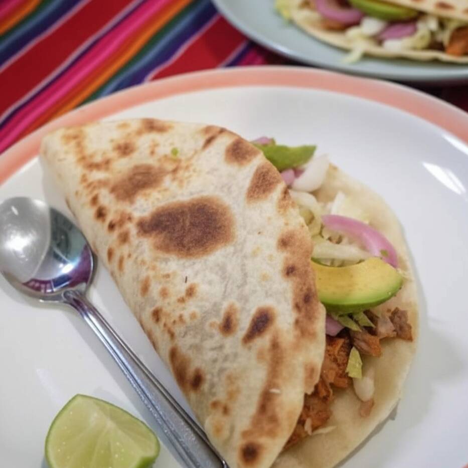 Quesadilla de cochinita, preparada con lechuga, cebolla, queso y aguacate.