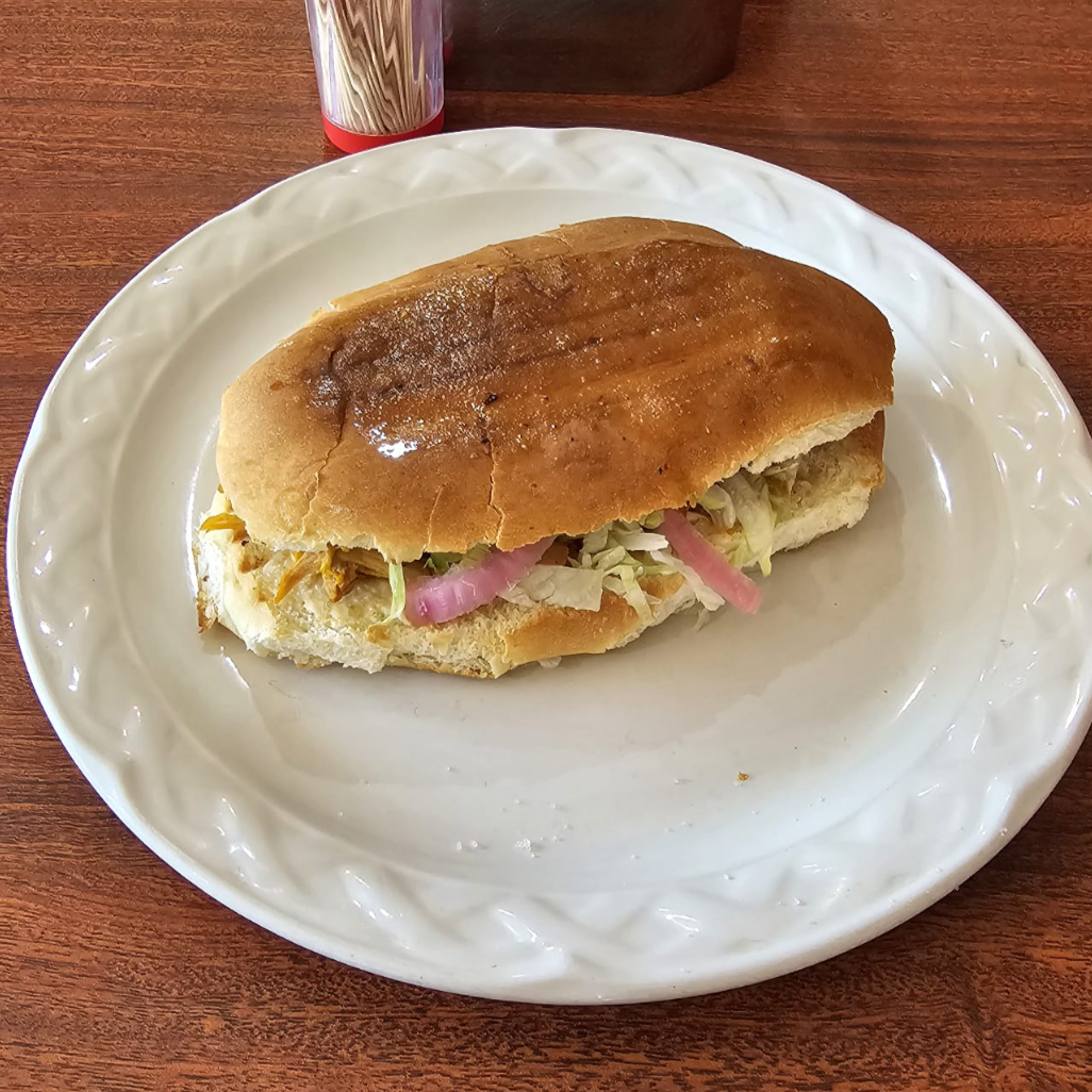 Deliciosa torta de cochinita con lechuga, cebolla, aguacate, chiles jalapeños y consomé.