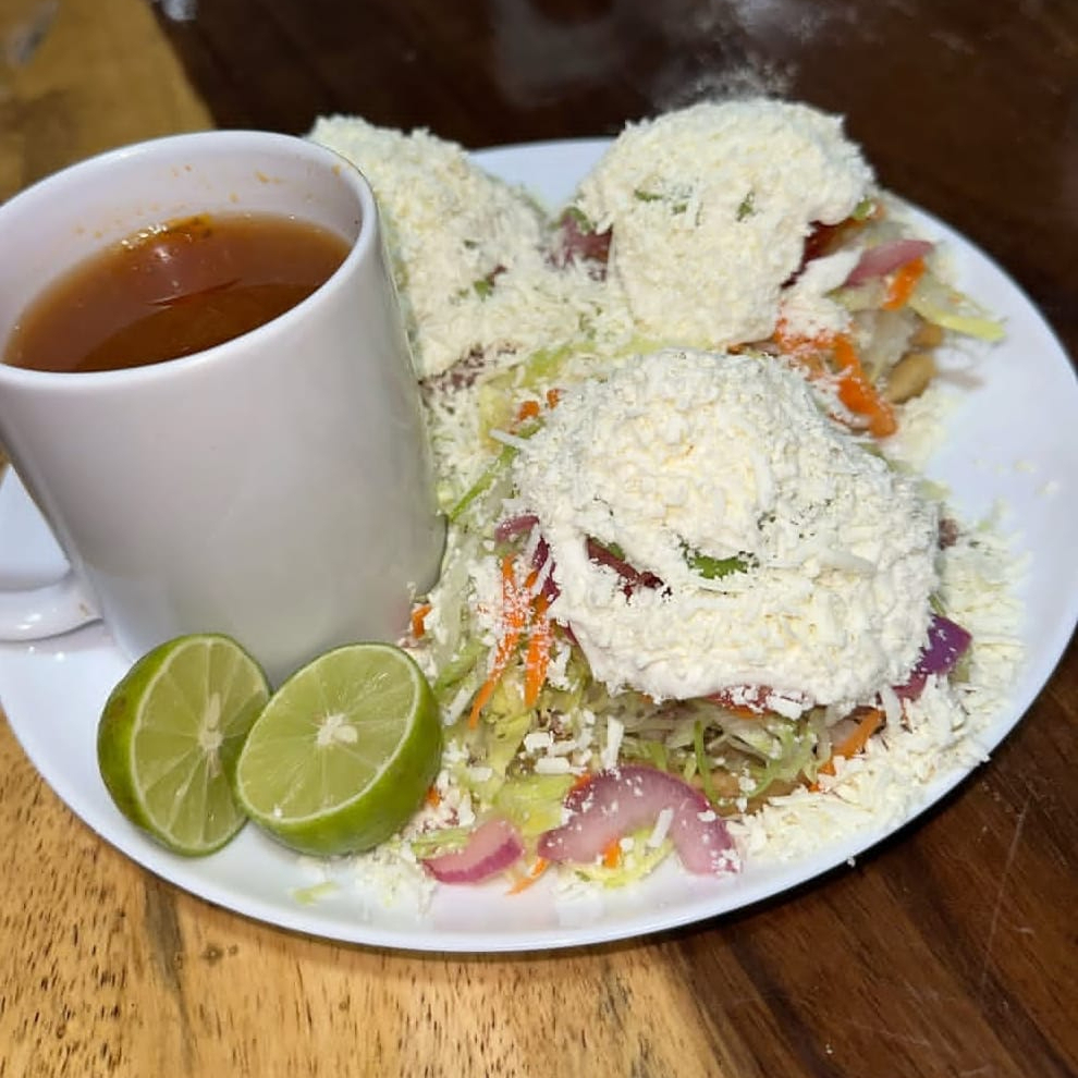 Gordita de res preparada con frijol, lechuga, zanahoria, cebolla, pepino, queso, media crema, salsa y consomé. Plato personal.