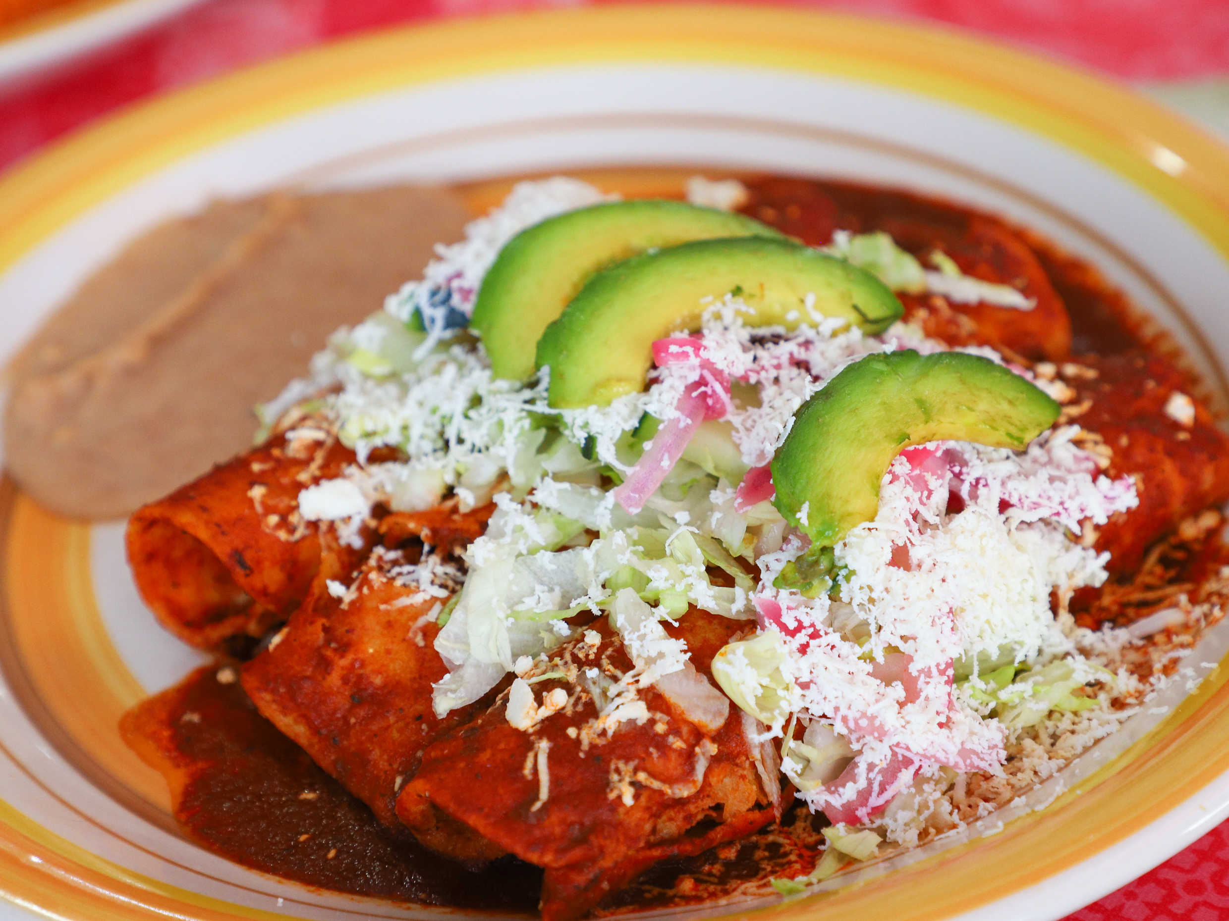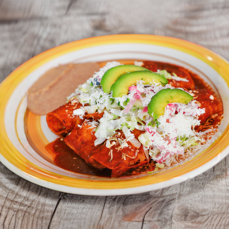 Orden de 3 enchiladas. Bañadas en chile colorado, rellenas de res, servidas con lechuga, pepino, cebolla curtida, queso y aguacate. Acompañadas con frijoles.