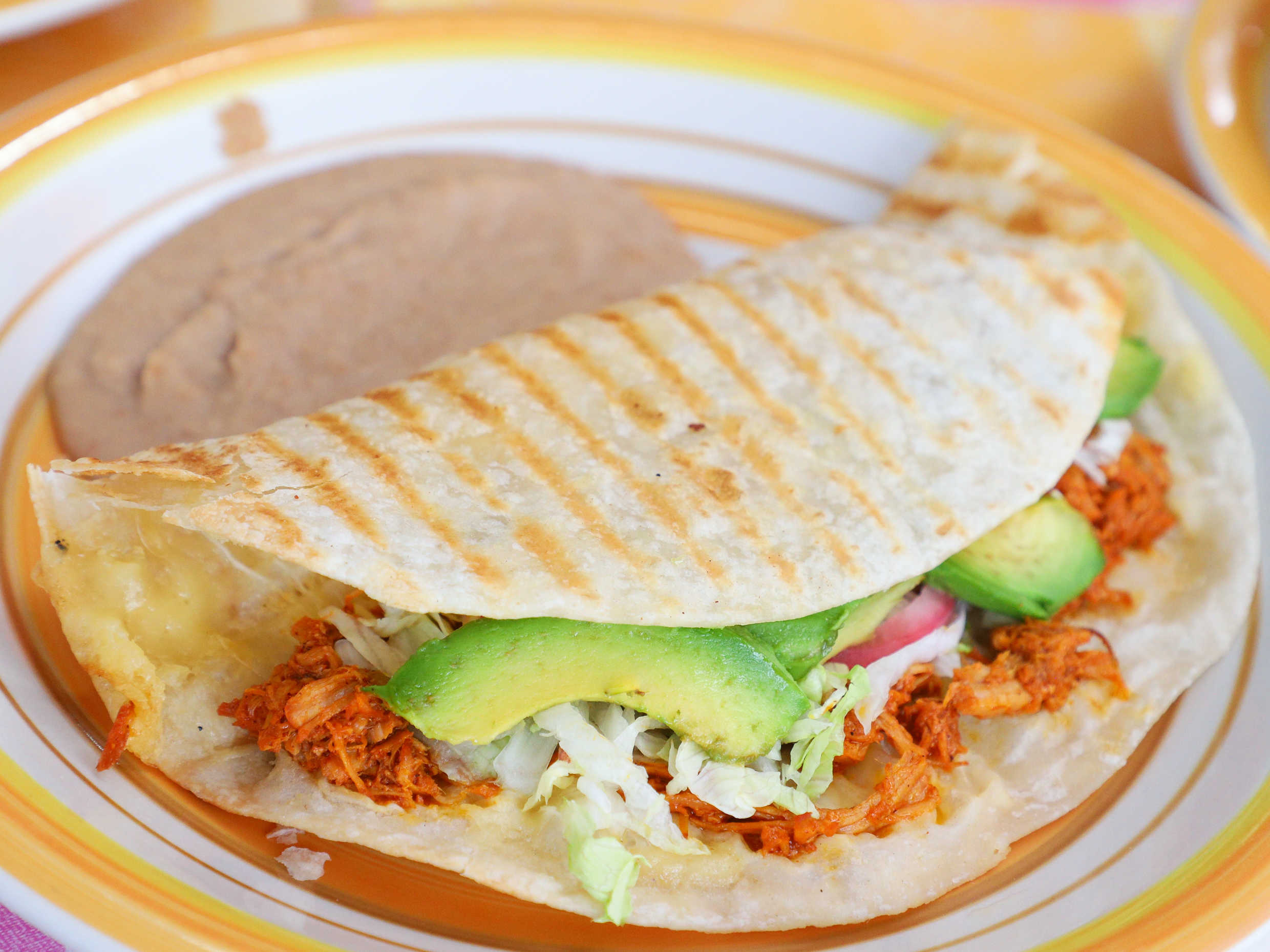 Tortilla de harina con queso manchego rellena de cochinita pibil acompañado de lechuga, cebolla curtida y aguacate. Servido con frijoles refritos.