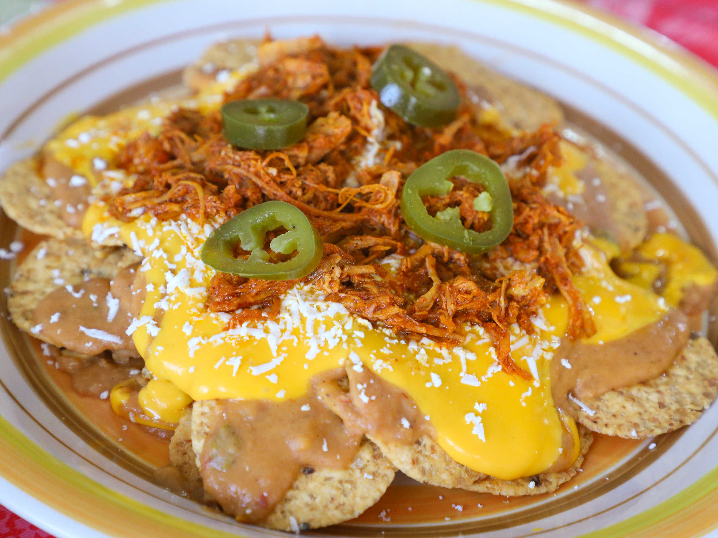 Totopos bañados con frijoles puercos, queso amarillo, queso rallado, cochinilla y chiles curtidos.