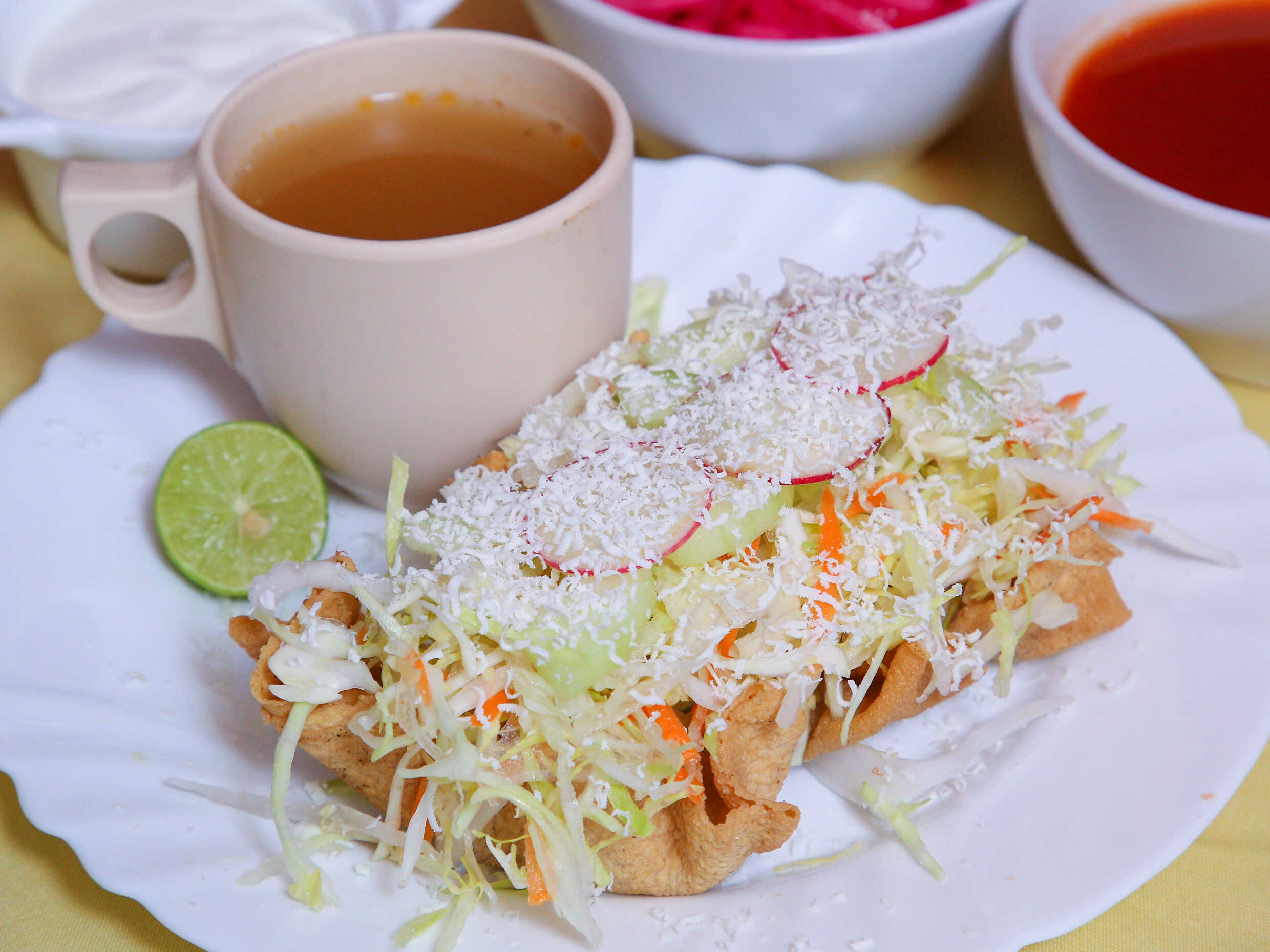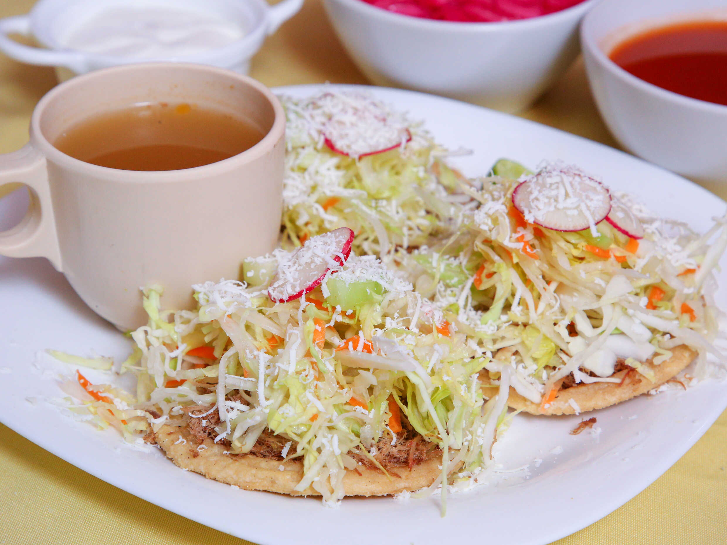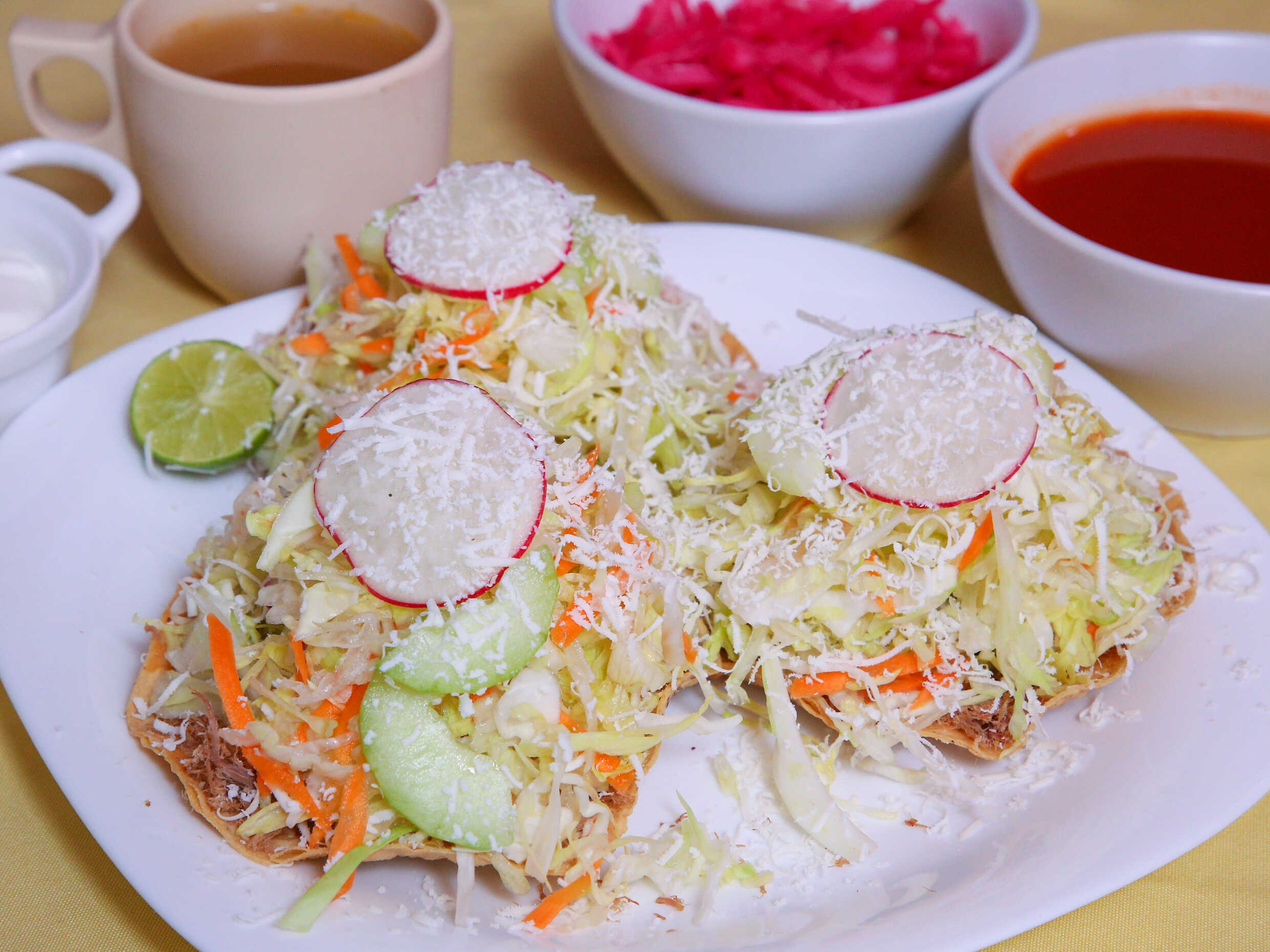 Orden de 3 tostadas de requesón, acompañadas con lechuga, repollo, zanahoria, rábano, pepino, calabaza, limón y queso con caldo de res.