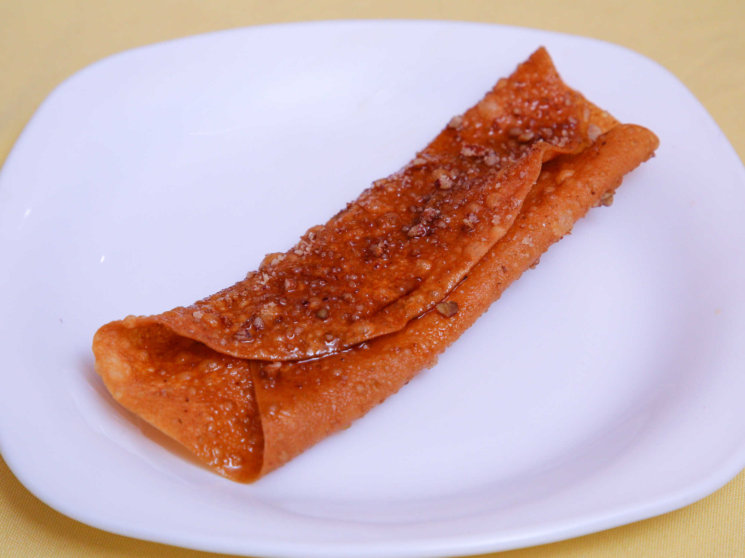 1 Buñuelos doblados enmielados con nuez encima.