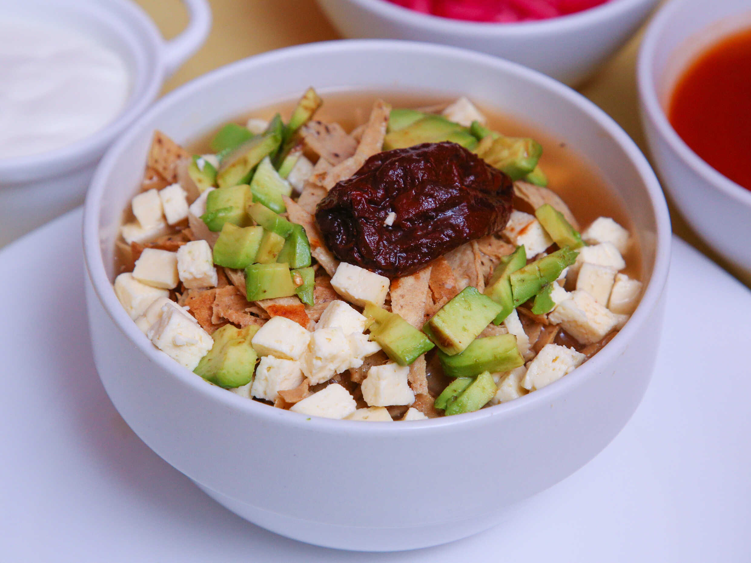 Sopa de tortilla frita con aguacate, chile chipotle, queso ranchero en cubos y caldo.