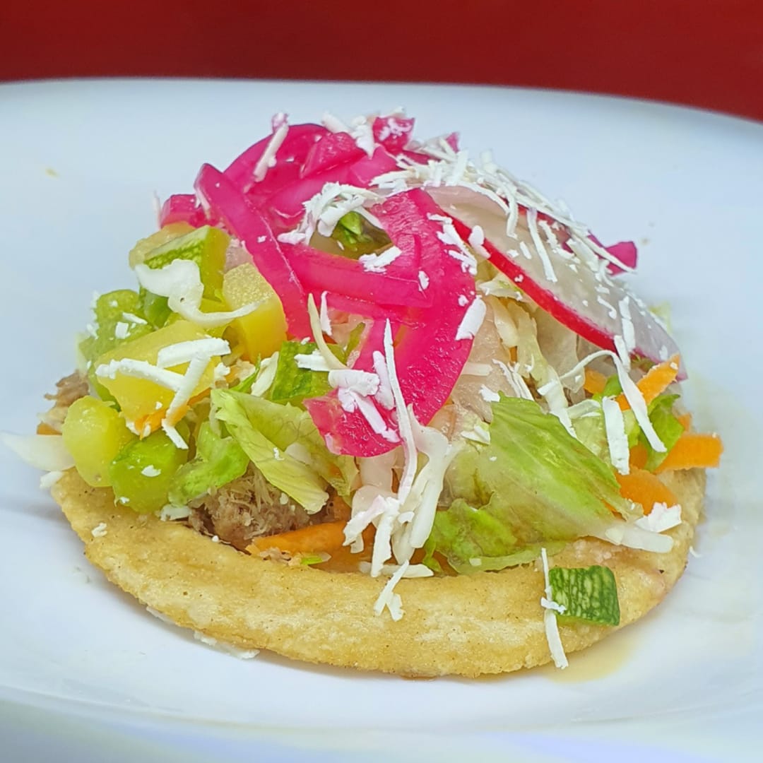 Orden de 1 gordita de carne, acompañadas con lechuga, repollo, zanahoria, rábano, pepino, calabaza, limón y queso con caldo de res.