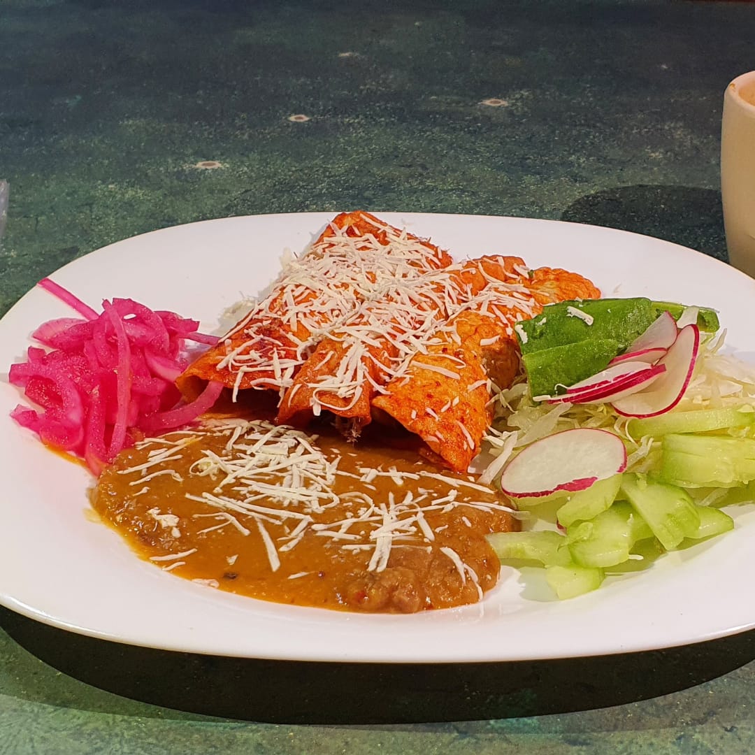 Orden de 3 enchiladas rojas de carne de res, acompañadas con frijol refrito, guarnición de verduras lechuga, repollo, zanahoria, aguacate, rábano y pepino, queso y caldo.
