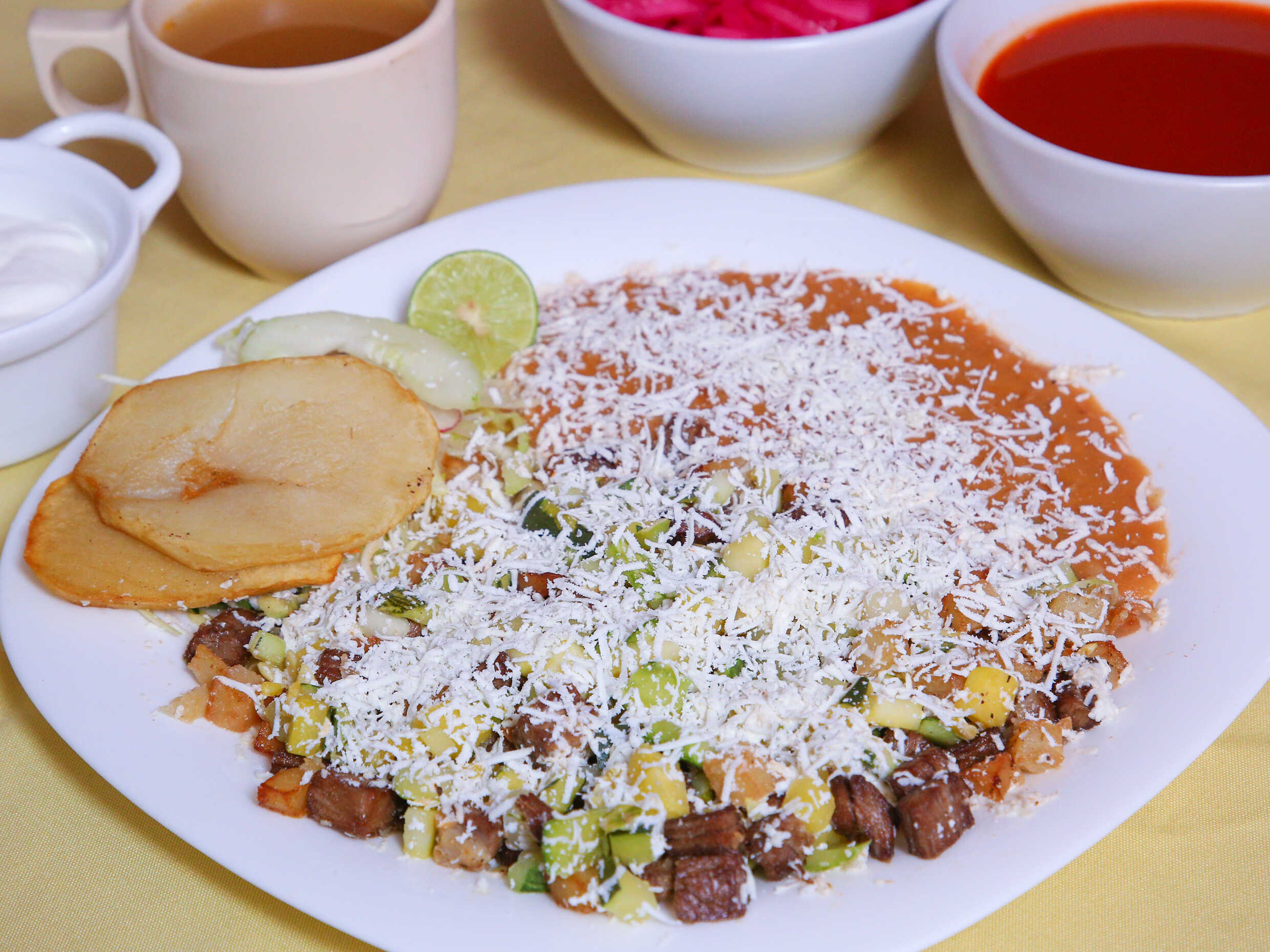 Cubos de carne de res y papa fritos, acompañados de guarnición de verduras lechuga, repollo, zanahoria, aguacate, rábano y pepino, tortillas, caldo y frijol refrito.