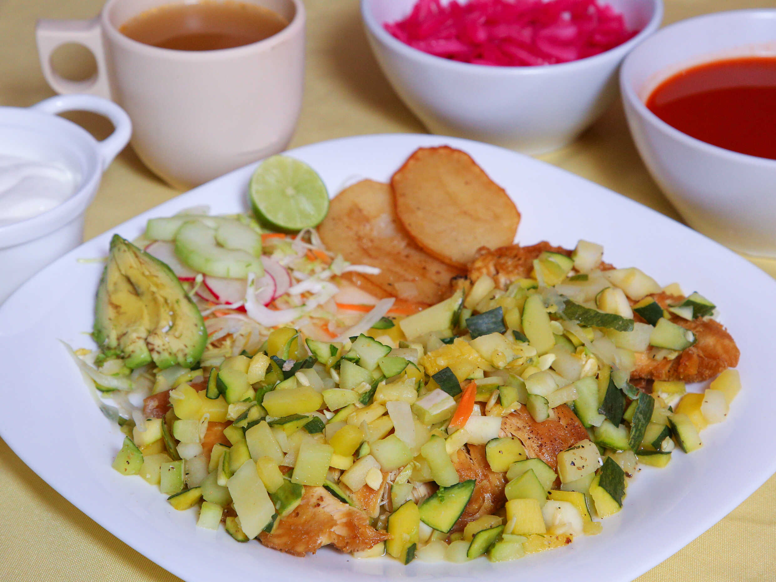 Pechuga de pollo frita con calabaza, guarnición de verdura lechuga, repollo, zanahoria, aguacate, rábano y pepino, tortillas y caldo.