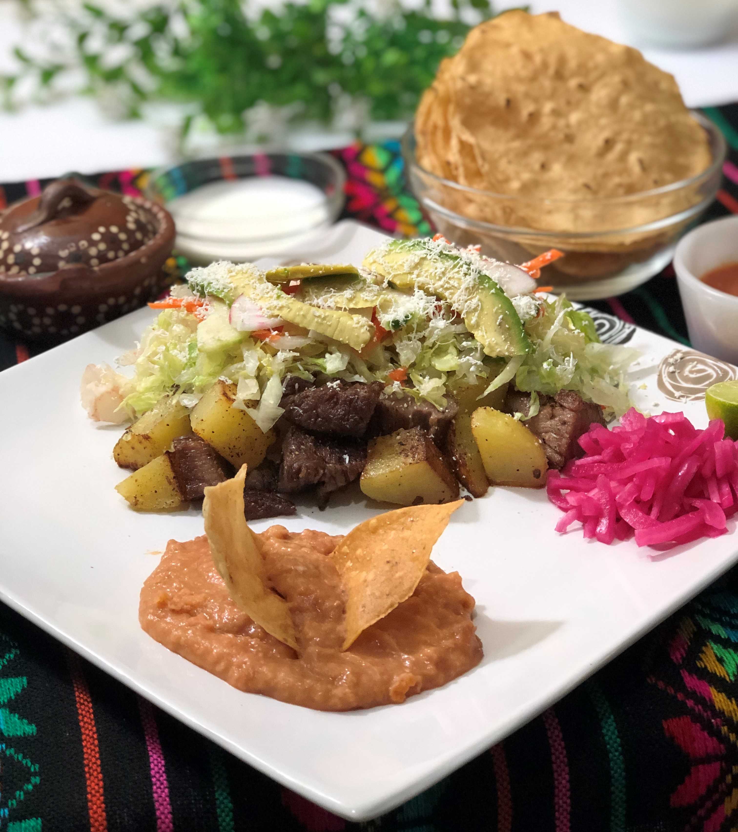 Frijol, res, lechuga, zanahoria, pepino, rábano, aguacate y queso.