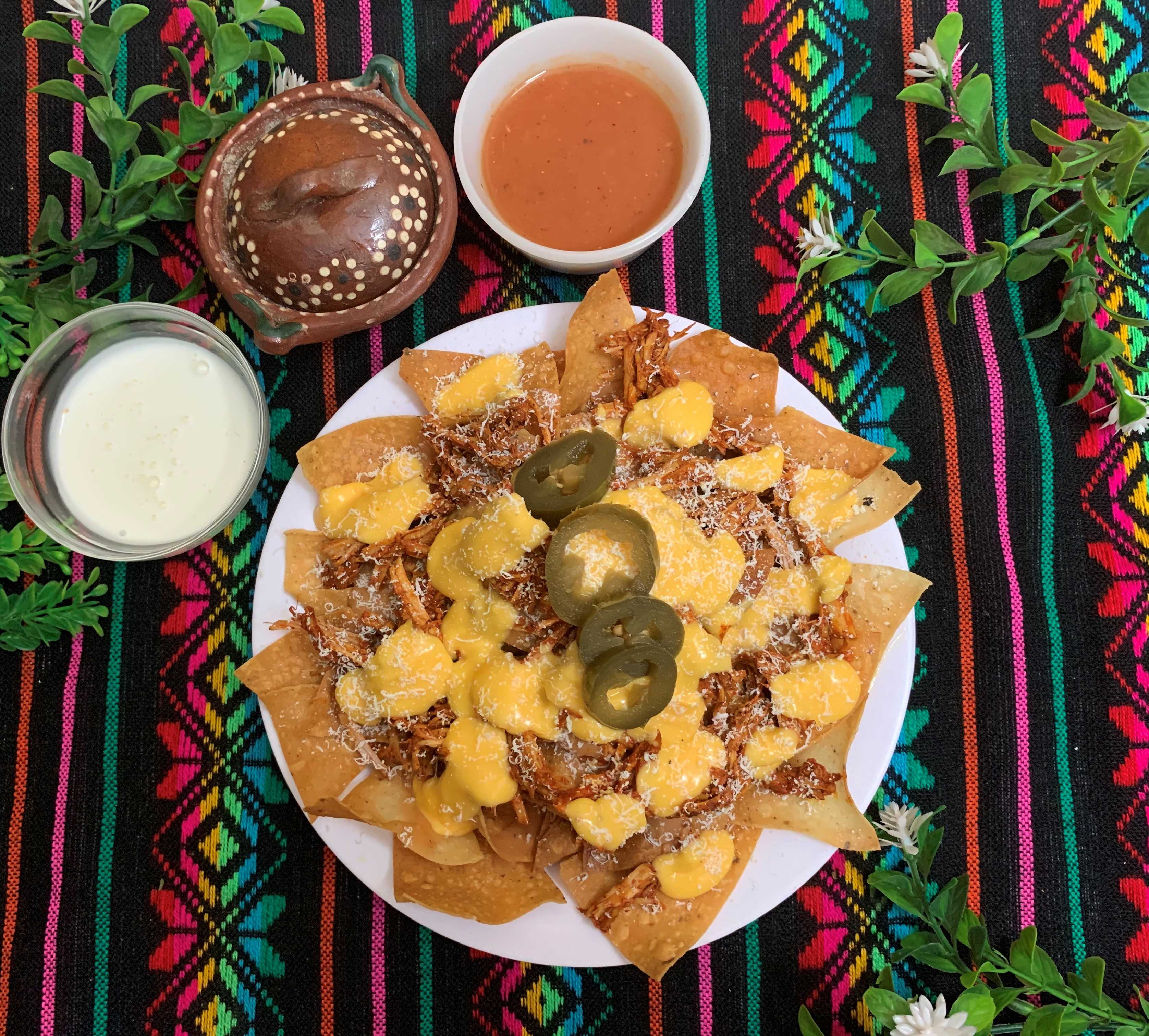 Totopos recién hechos bañados de frijol, cochinita y queso para nachos, queso rallado y jalapeño. *No se envía por separado.