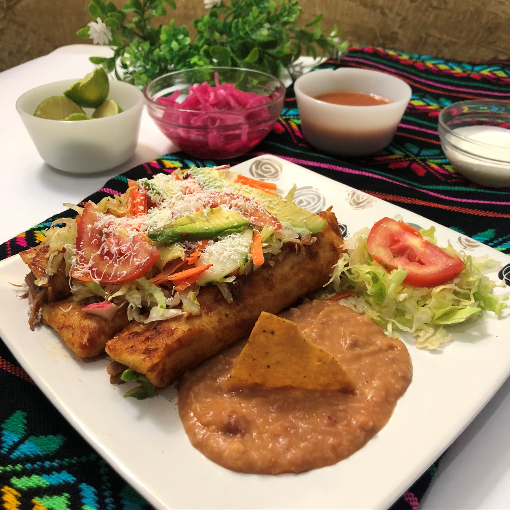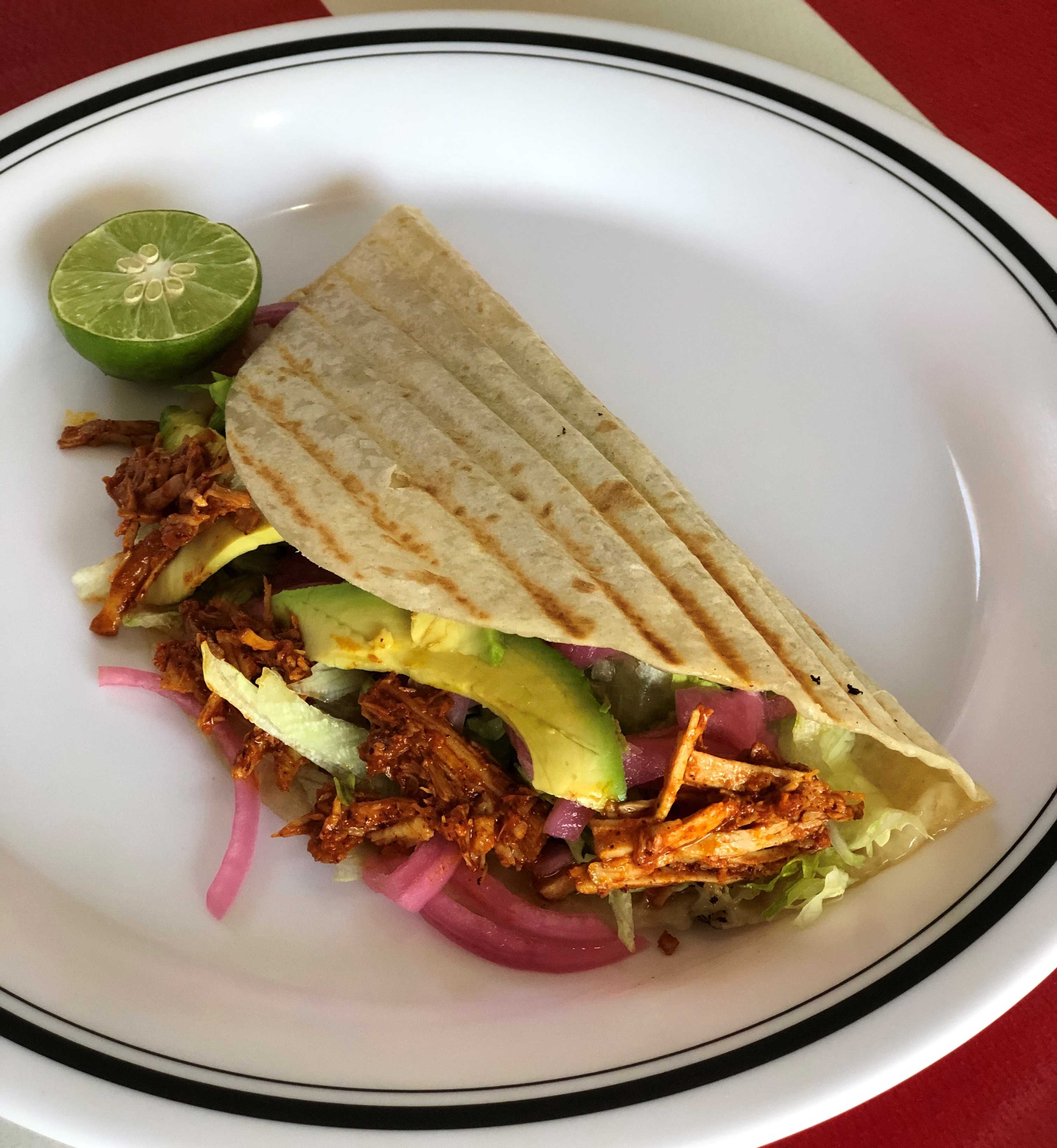 Cochinita, lechuga, cebolla, aguacate, tomate y chile.