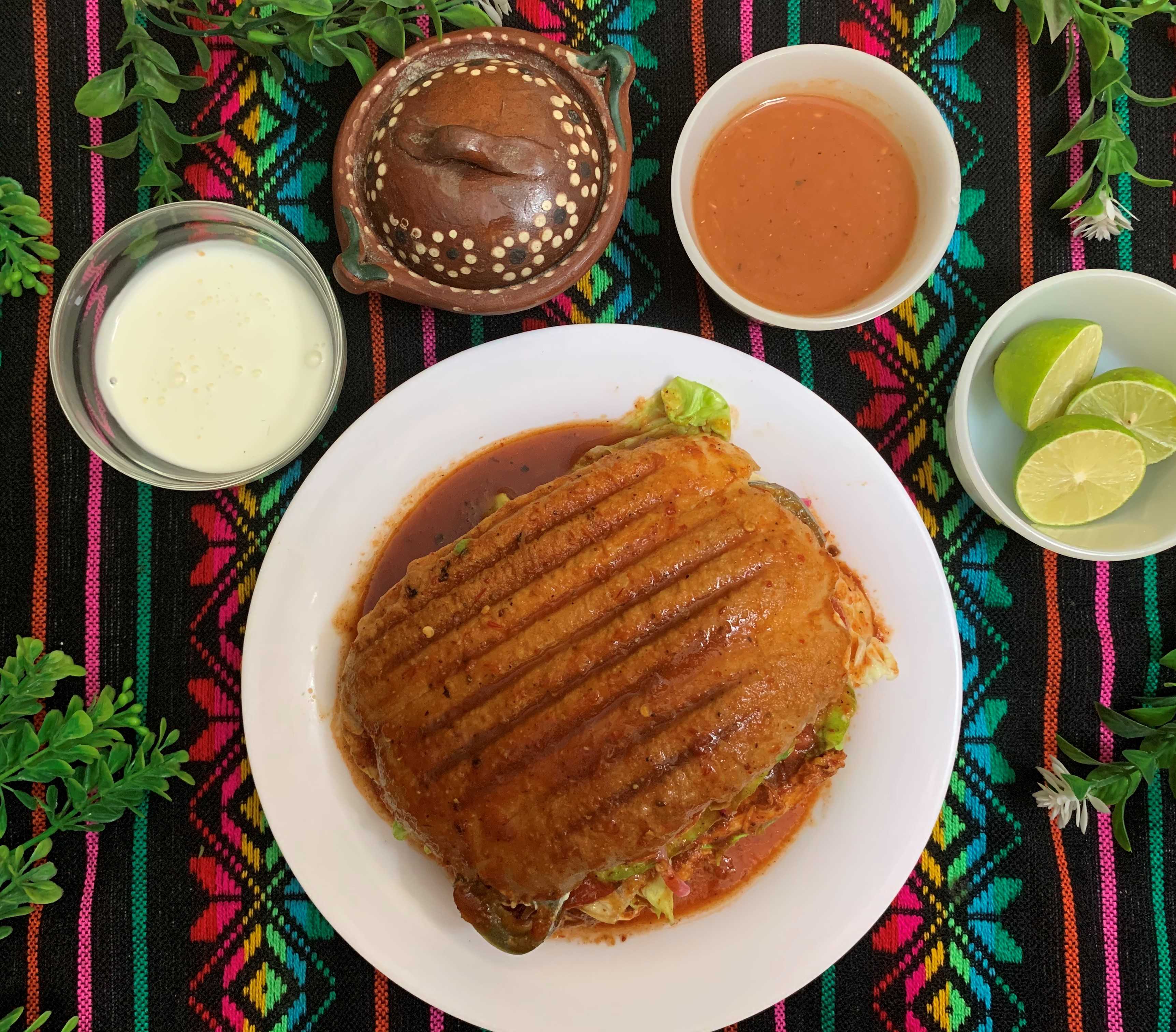 Pan telera, mayonesa, cochinita, jamón, queso, lechuga, tomate, cebolla, aguacate y chile.
