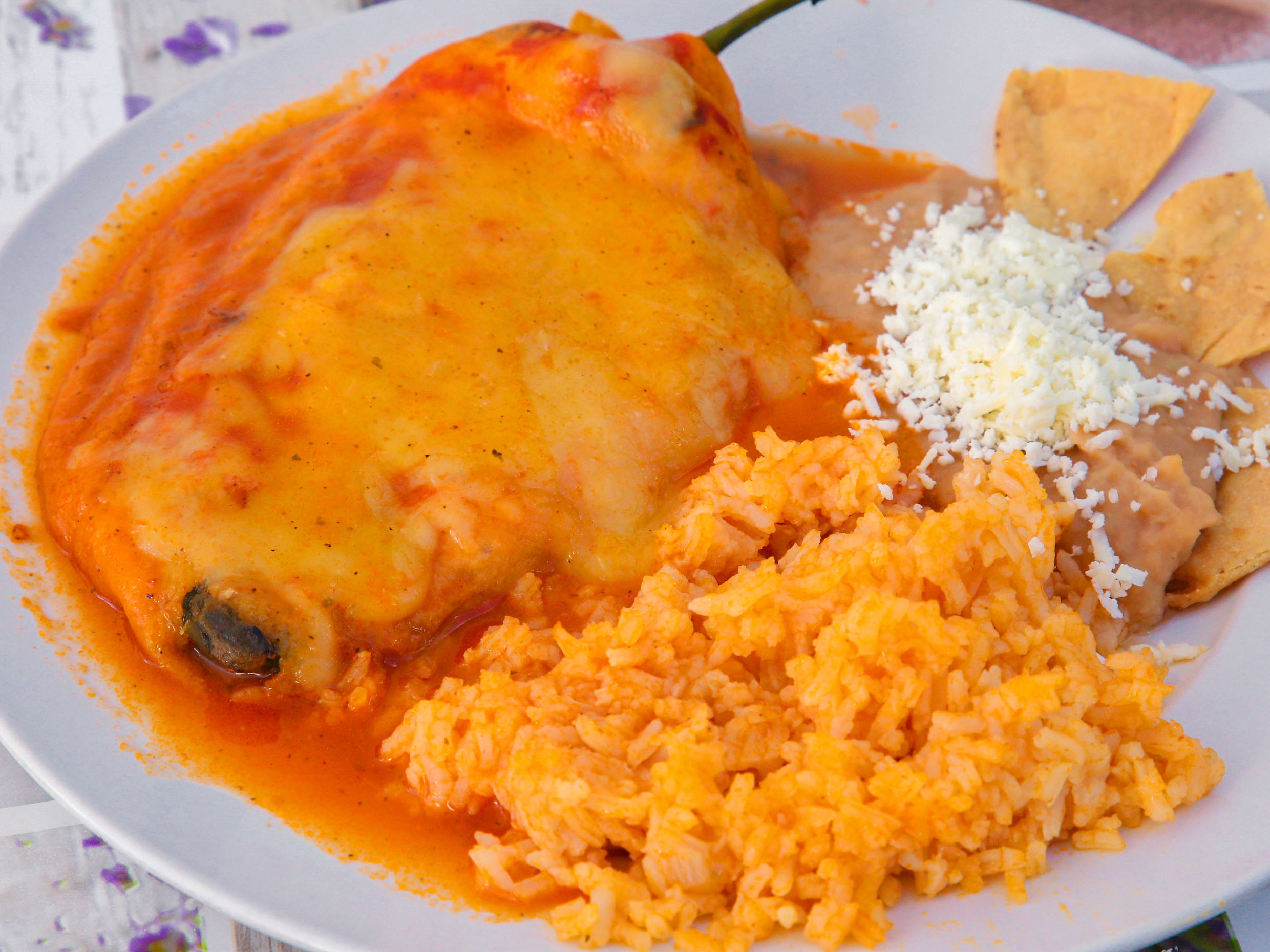 Relleno de queso chihuahua, arroz, frijol y 3 tortillas.