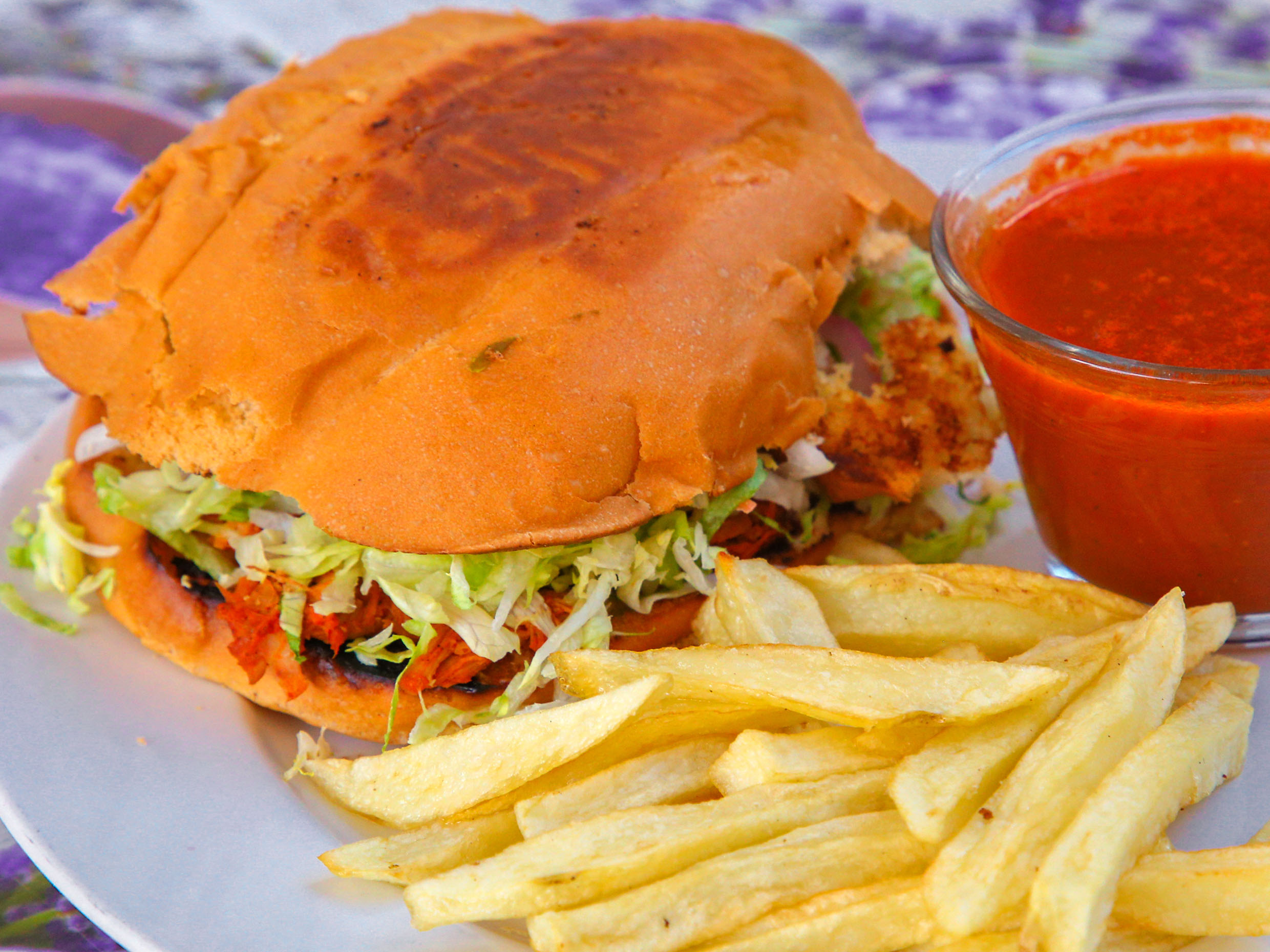 De cochinita, lechuga, cebolla curtida, chiles en raja, aguacate, porción de salsa especial de la casa.