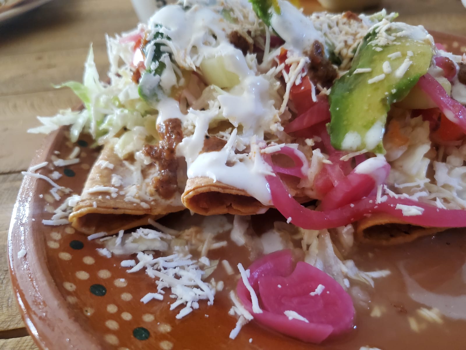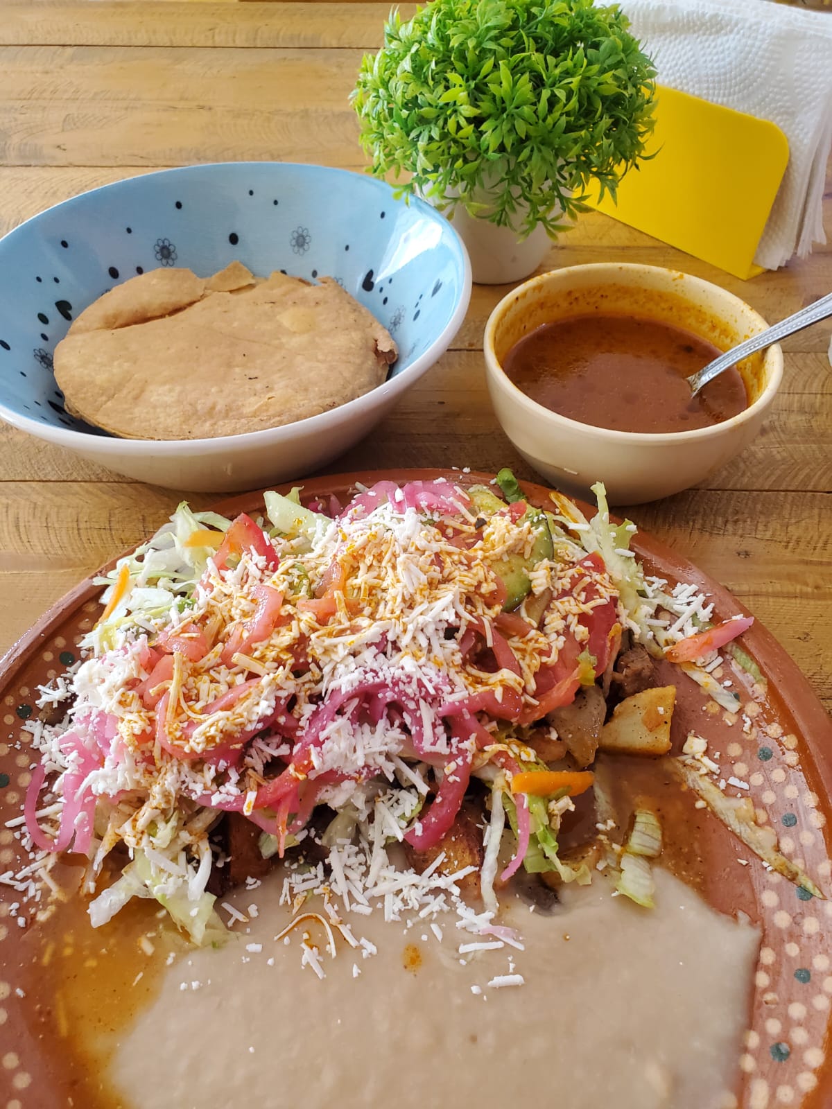 Pieza de tostada de res, con frijol, papa con carne deshebrada, y verdutas
