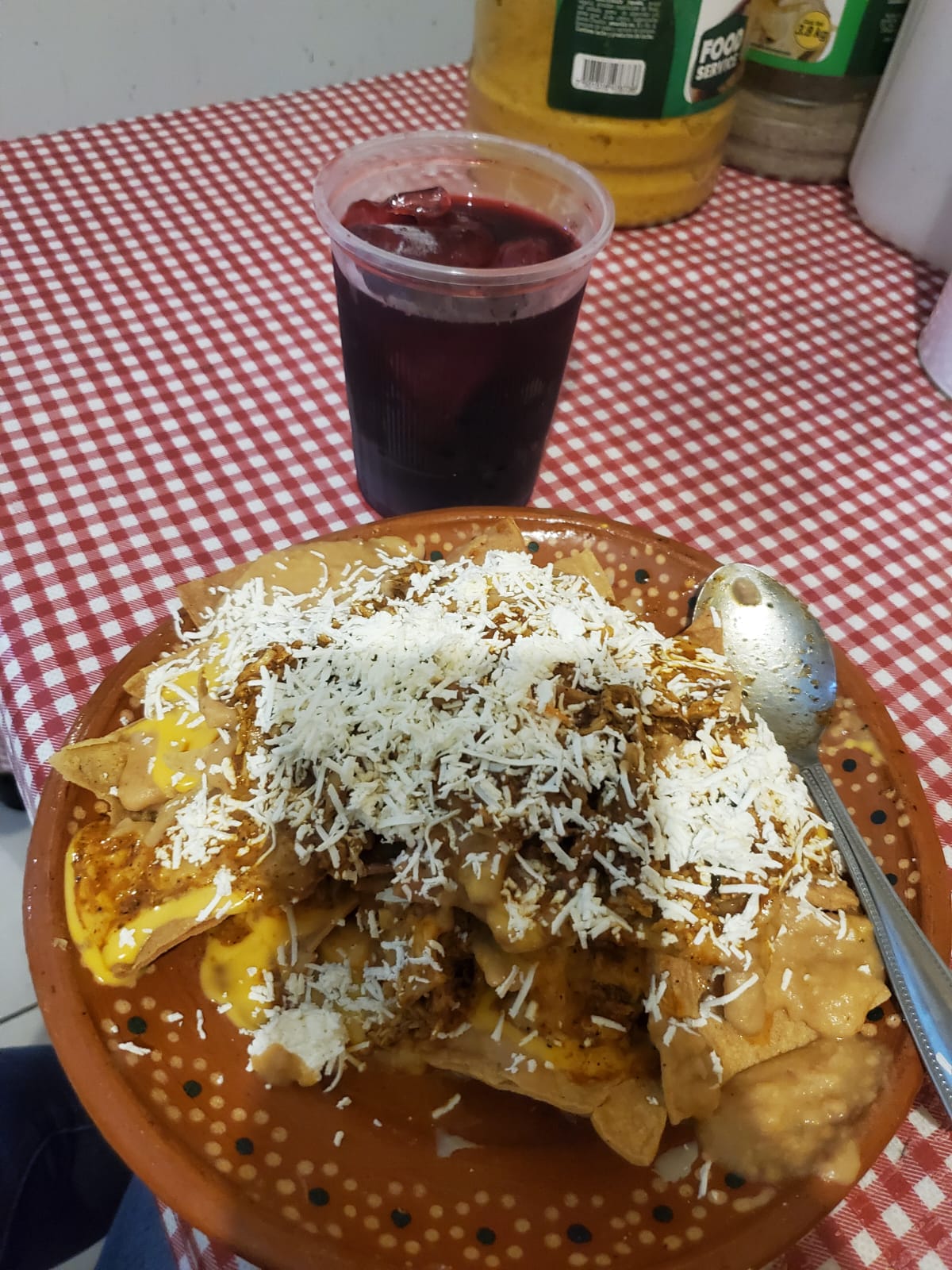 Cama de totopos de la casa, bañados en frijoles puercos, queso amarillo, cochinita y queso cotija, Acompañados de chiles jalapeños.