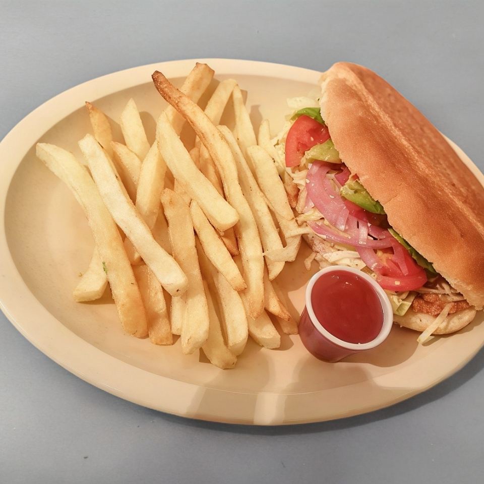Carne, jamón, queso, lechuga, cebolla, tomate. Incluye papas.