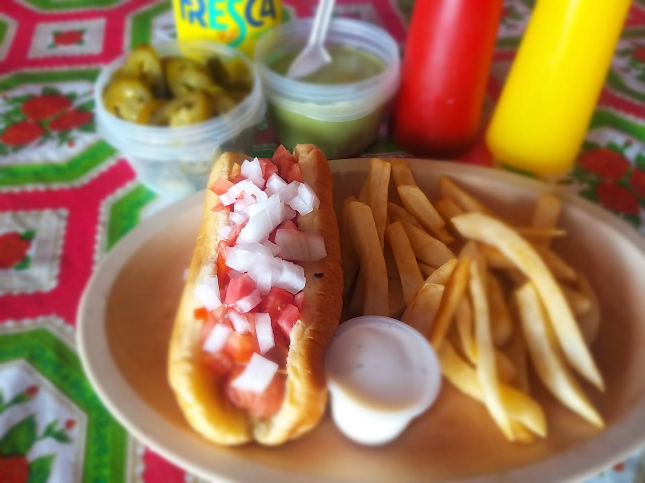 Salchicha, tocino, tomate y cebolla, incluye papas.