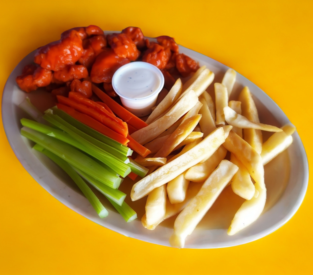 250 gr bañadas en salsa a elegir, llevan vegetales y aderezo ranch.